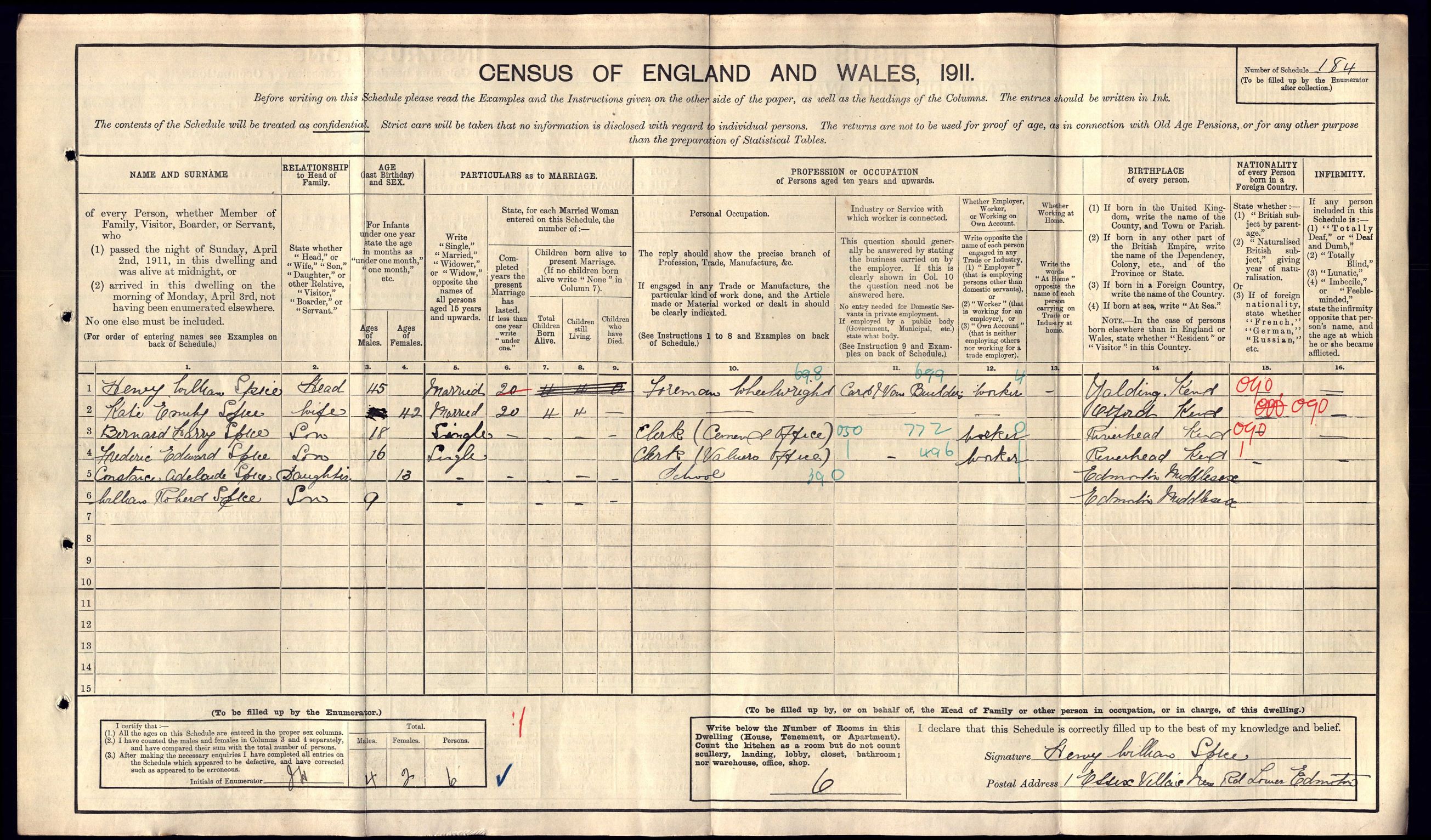 • Lived at: 1 Essex Villas, New Road, Lower Edmonton, 1911, Middlesex, England.