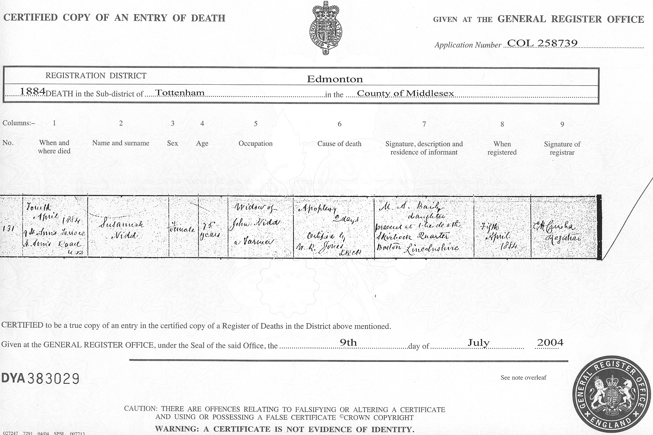 England and Wales, death certificate for Susannah Nidd, died Fourth April 1884; citing 3a/142/131, June quarter 1884, Edmonton registration district, Tottenham sub-district; General Register Office, Southport. Rec. Date: Jul 2008. ID: DC. Cit. Date: Jul 2004. Cit. ID: DYA 383029, Surety: 4; #131
