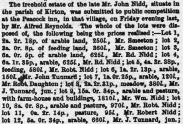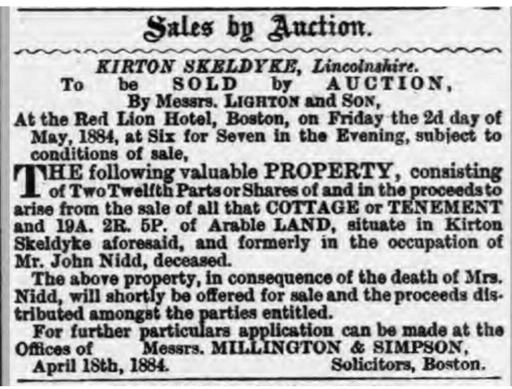 • Newspaper Article: sale of property after Susannah's Nidd, 1884, Kirton, Lincolnshire, England. Susanna married John Nidd, son of Richard Nidd and Ann North, on 9 Feb 1836 in Lowestoft, Suffolk, England.1 2 (John Nidd was born in 1790 in Burton Coggles, Lincolnshire, England 4, baptized on 25 Dec 1790 in Burton Coggles, Lincolnshire, England,12 13 died on 4 Nov 1871 in Kirton, Skeldyke, Lincolnshire, England 14 15 16 and was buried on 9 Nov 1871 in Kirton, Lincolnshire, England 17.). The cause of his death was hepatits. |