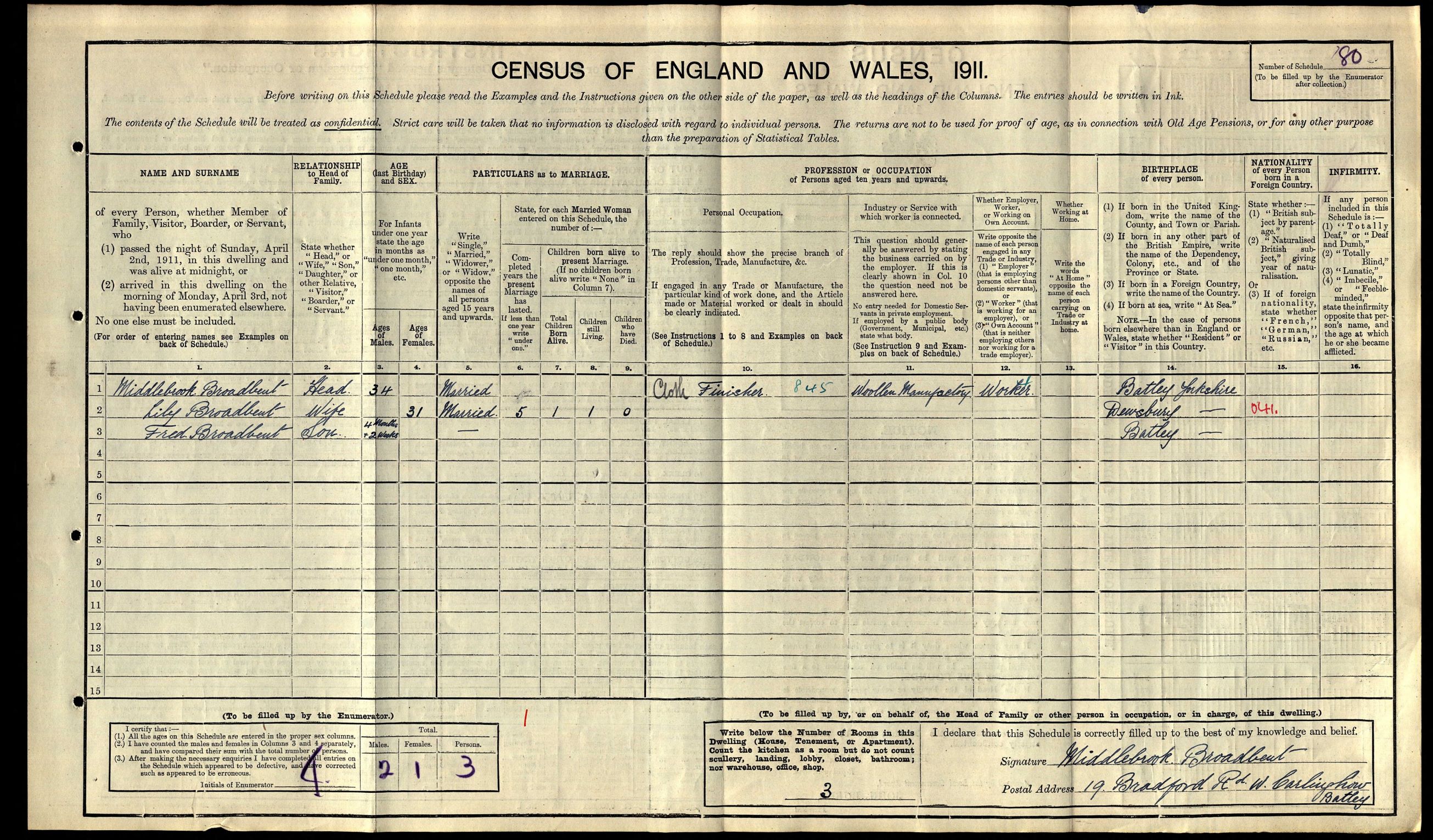 • Lived at: 18 Richmond Street, 1939, Batley, Yorkshire, England. Lillie married Middlebrook Broadbent on 10 Jun 1905 in Brownhill, St Saviour, Yorkshire, England. (Middlebrook Broadbent was born on 1 Sep 1876 and died Mar Q 1955.) |
