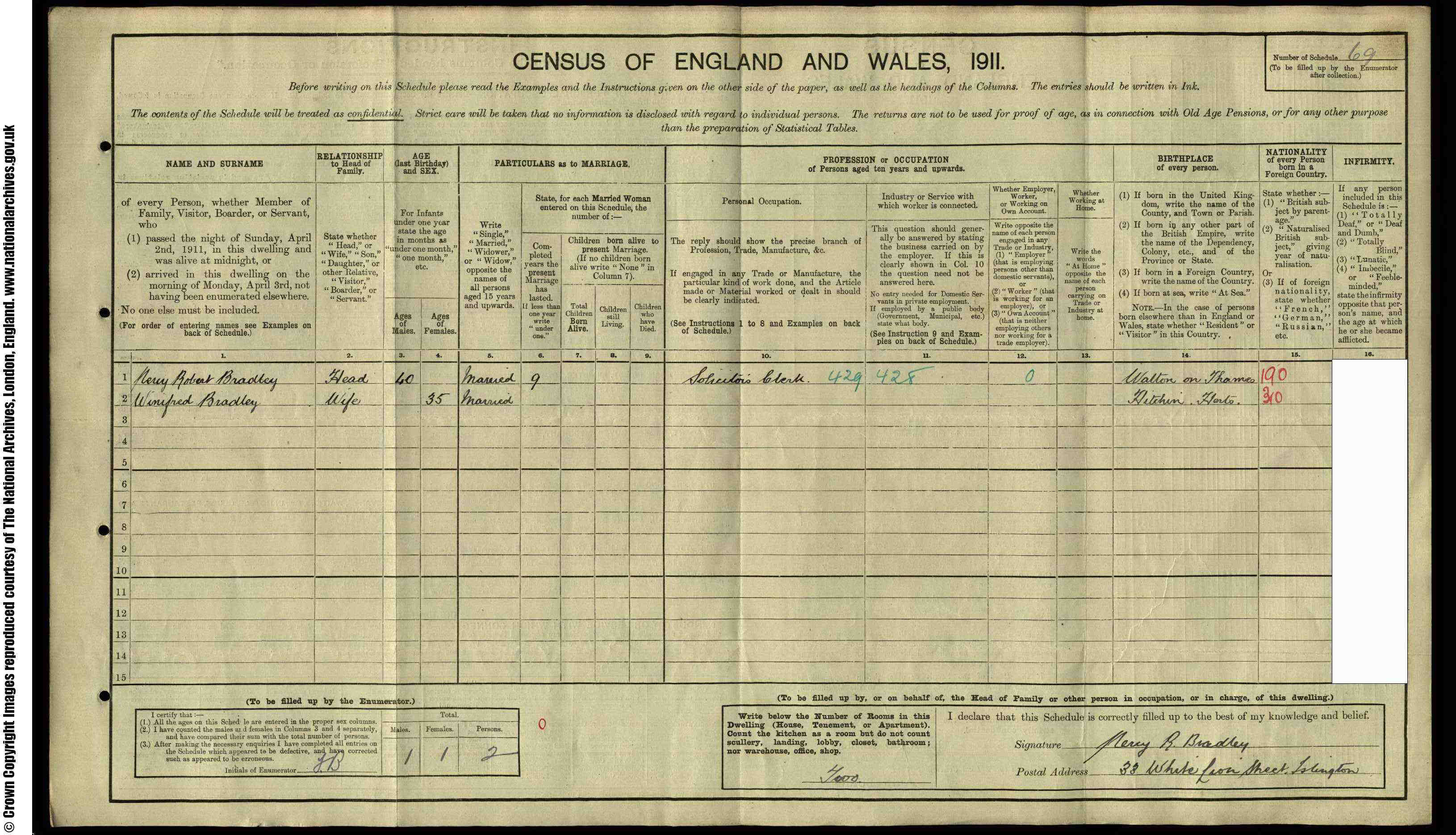 • Occupation: Solicitor's Clerk, 1911, Islington.