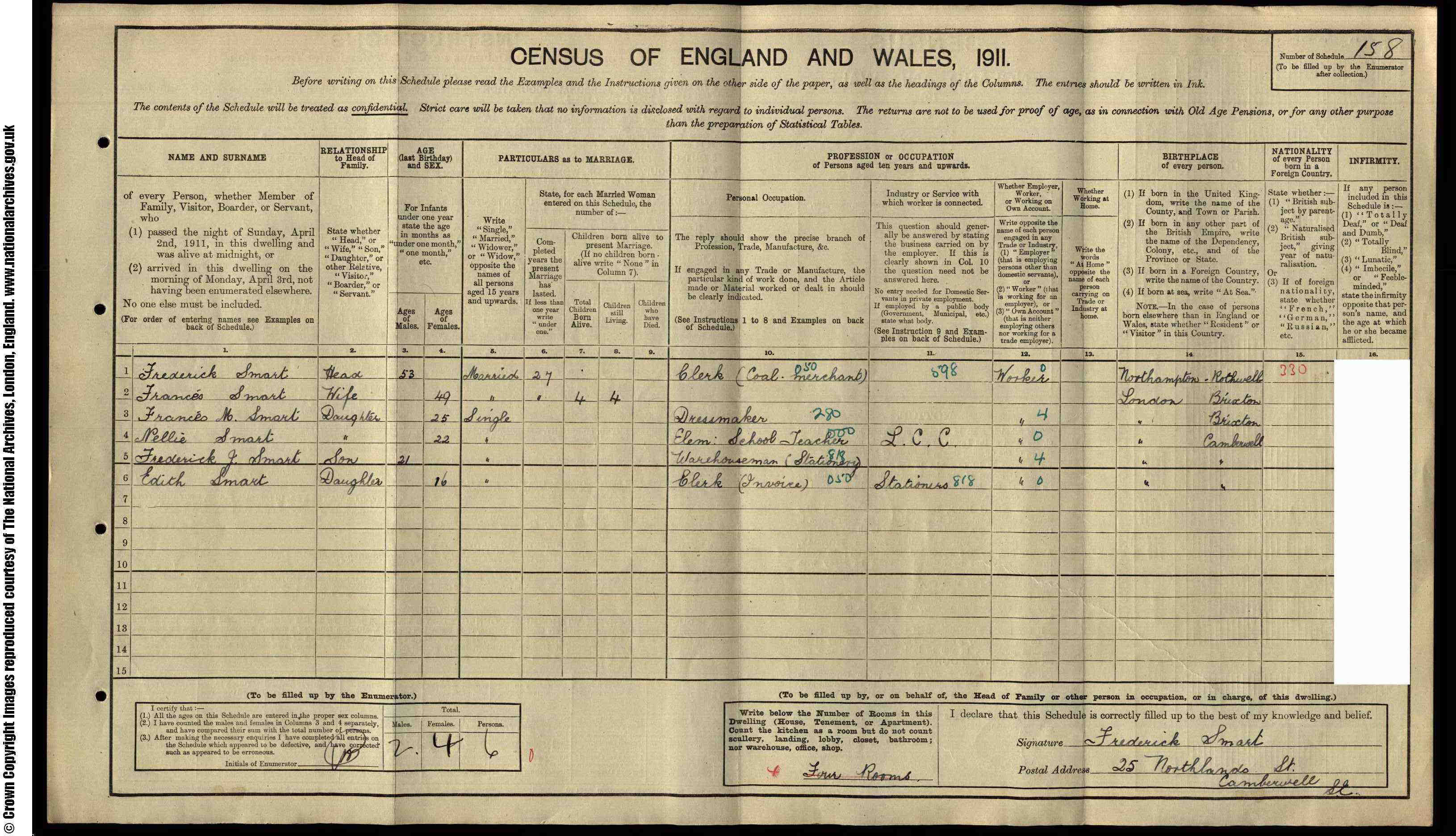 • Lived at: 26 Northlands St, 1911, Camberwell, Surrey, England.