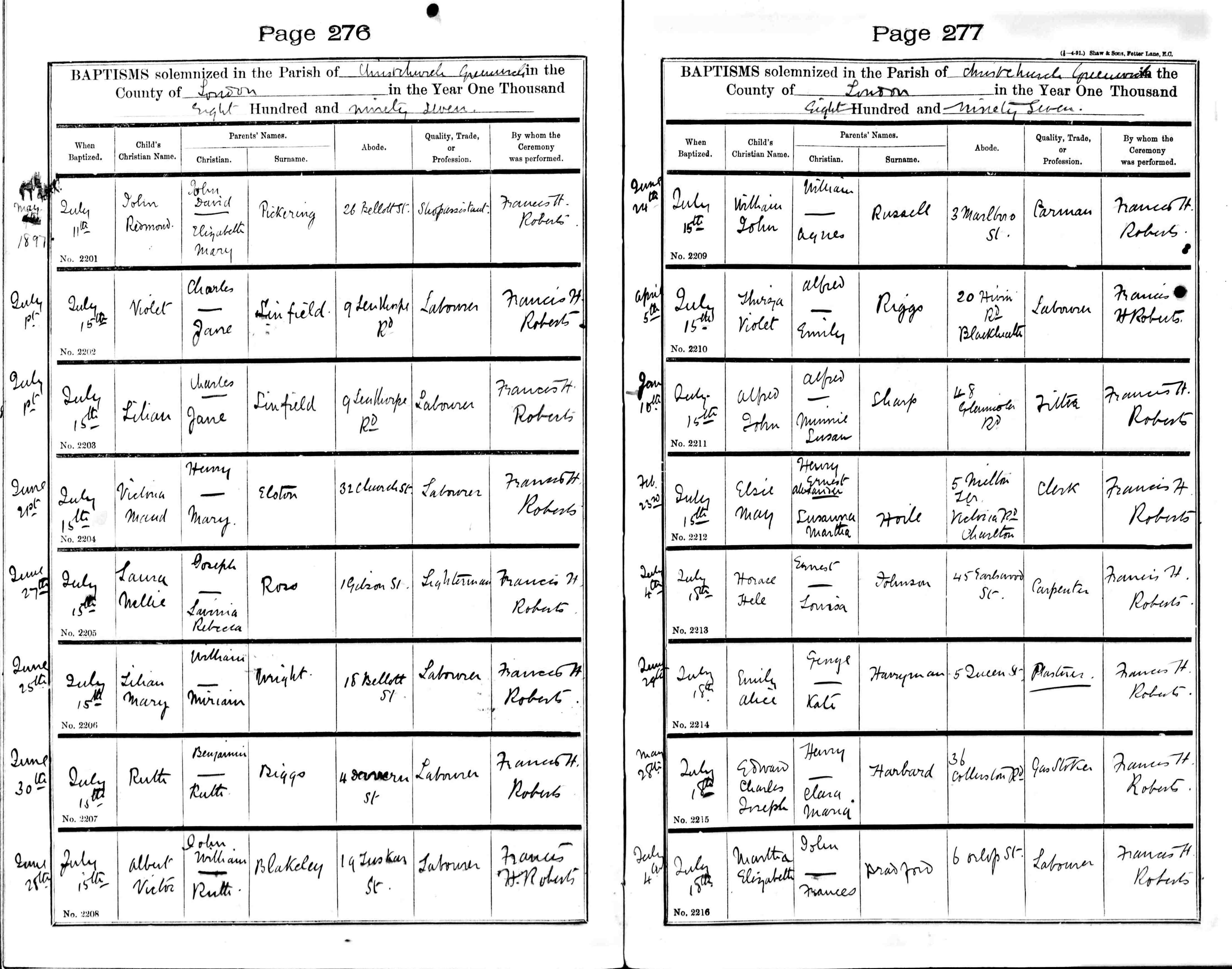 2 (1901 English and Welsh Census(London, TNA/Ancestry.co.uk, 2002) , Web site showing copies of original enumerator schedules) ID: CEN 1901, RG 13 539 Greenwich St. Alphage pages 25 and 26. Cit. ID: CEN 1901 RG13/539. Surety: 3.