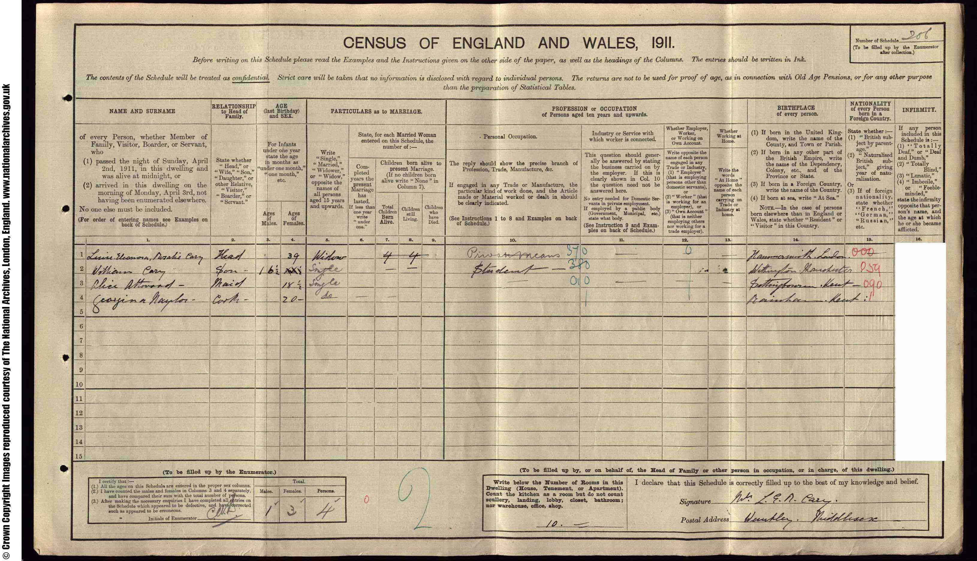 1901 census of England, Somerset, Chatham, folio 43, page 25, Charles and Elizabeth Taylor; digital images, Ancestry, Ancestry.co.uk (www.ancestry.co.uk : accessed 22 Feb 2009); citing PRO RG 13/730. Cit. Date: 22 Feb 2009. Surety: 4.