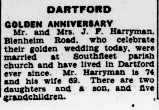 • Newspaper Article: Celebrated 50th Wedding Anniversary, 6 Oct 1950, Dartford, Kent, England. Kent Messenger James married Ada King on 6 Oct 1900 in Southfleet, Kent, England.1 (Ada King was born on 23 Feb 1880 in East Farleigh, Kent, England 8 and died after 1950 8.) |