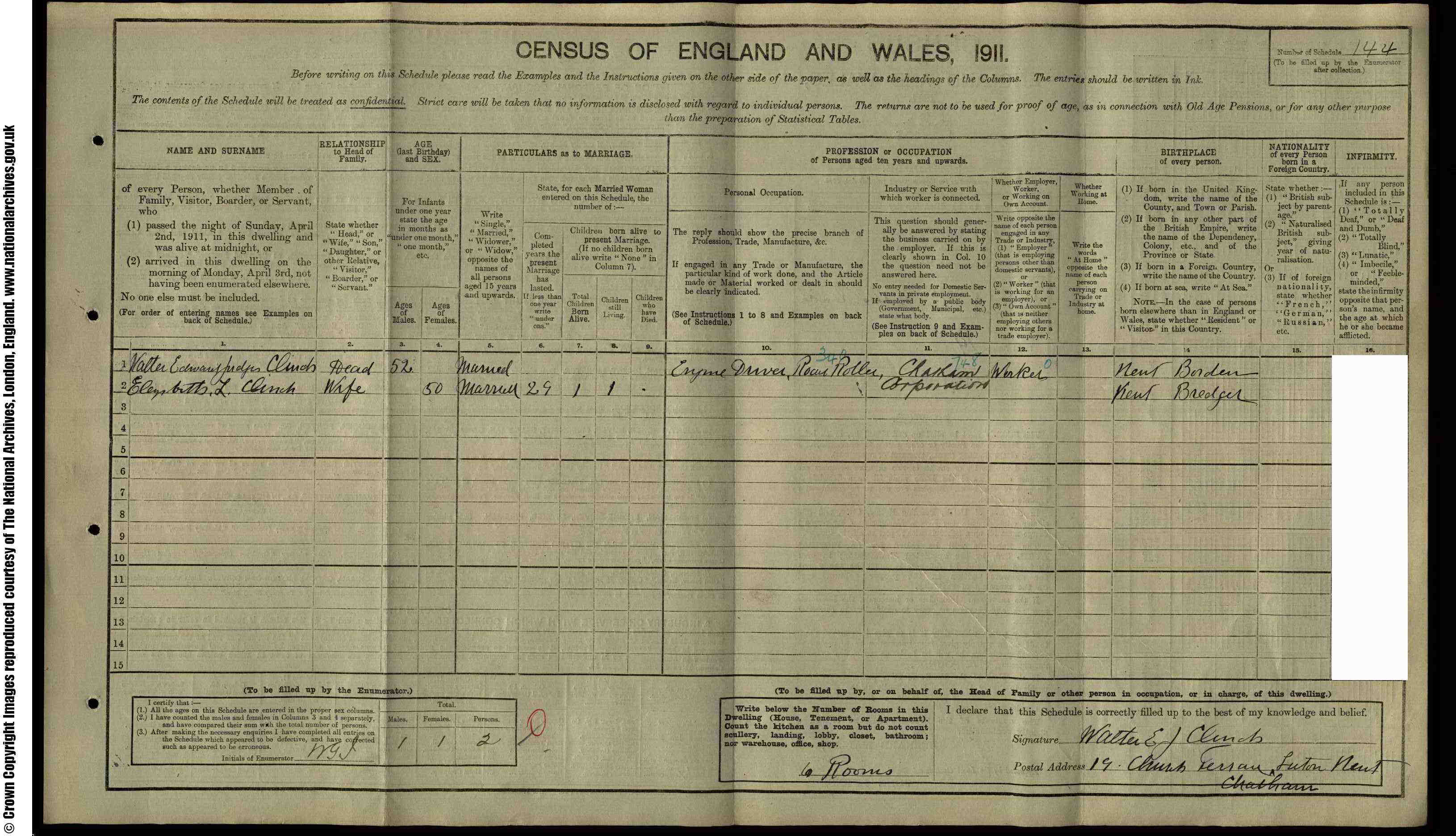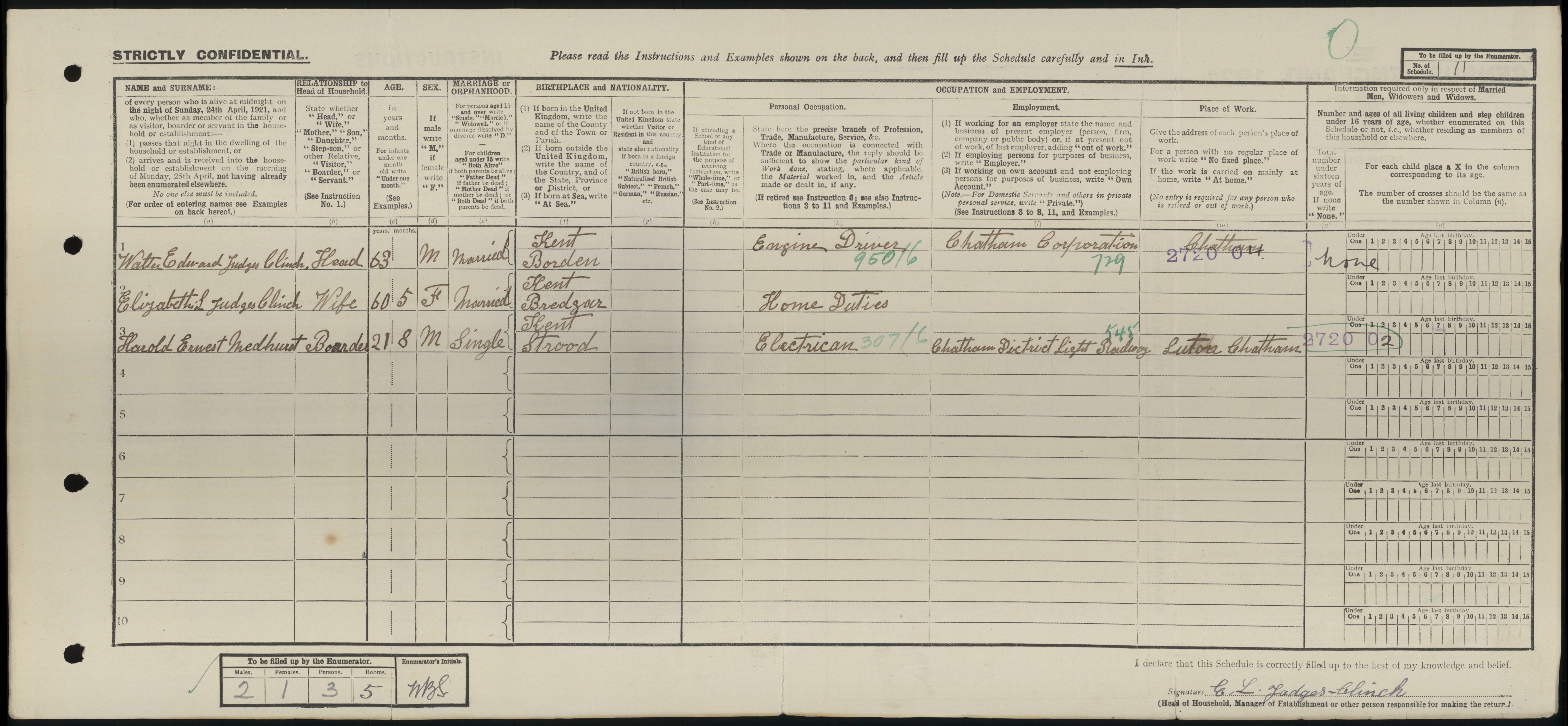 Other names for Walter were Walter Edward Judges and Walter Edward Judges Clince. Events • Lived at: Eynham Hatch, 1861, Borden, Kent, England. 1 • Lived at: 4 Thornton Cottages, Beacon Hill, 1891, Chatham, Kent, England. 2 • Lived at: 19 Church Terrace, 1901, Chatham, Kent, England. 3 • Occupation: Engine Driver Steam Roller, 1901, Chatham, Kent, England. 3 • Lived at: 19 Church Terrace, Luton Mews, 1911, Chatham, Kent, England.