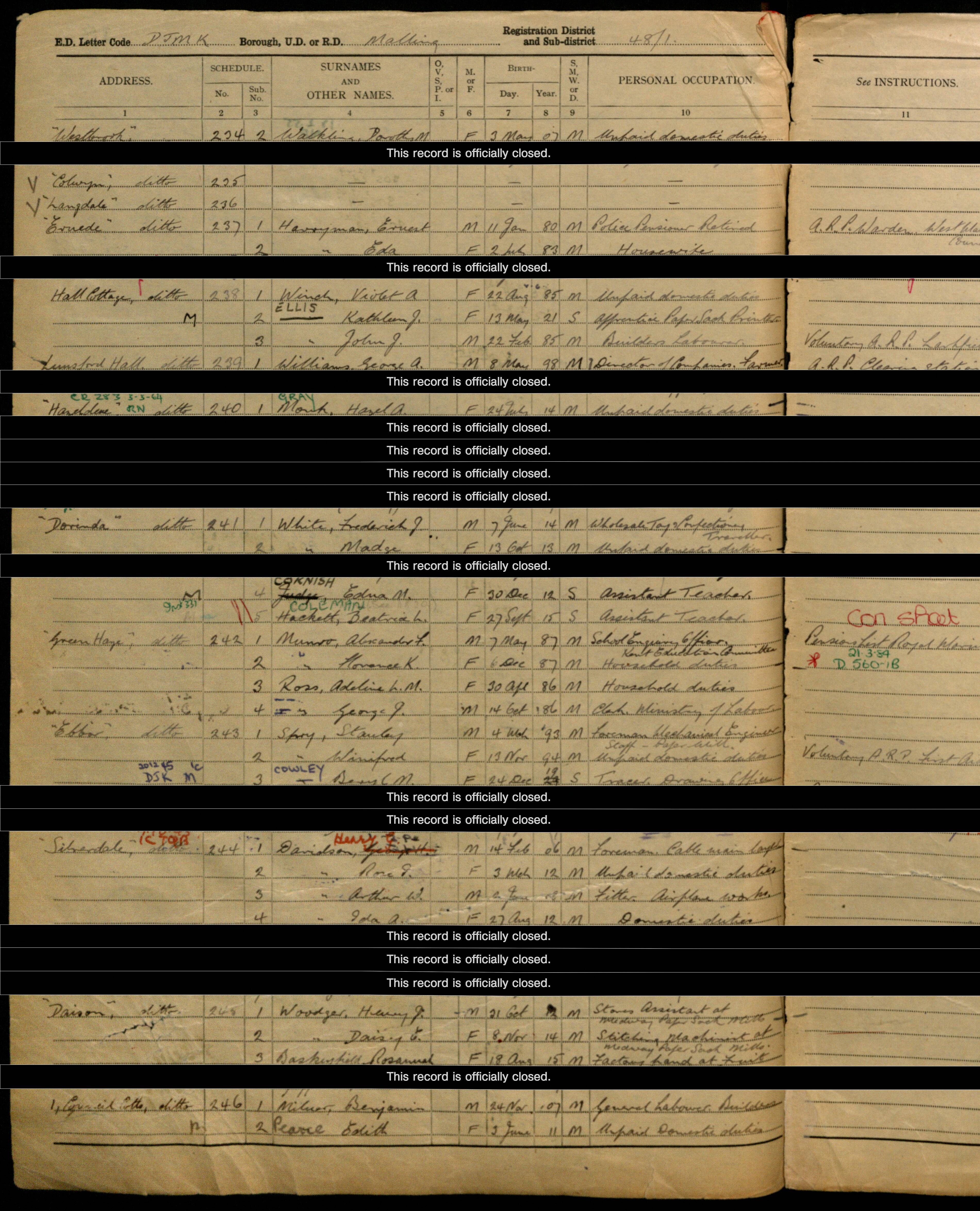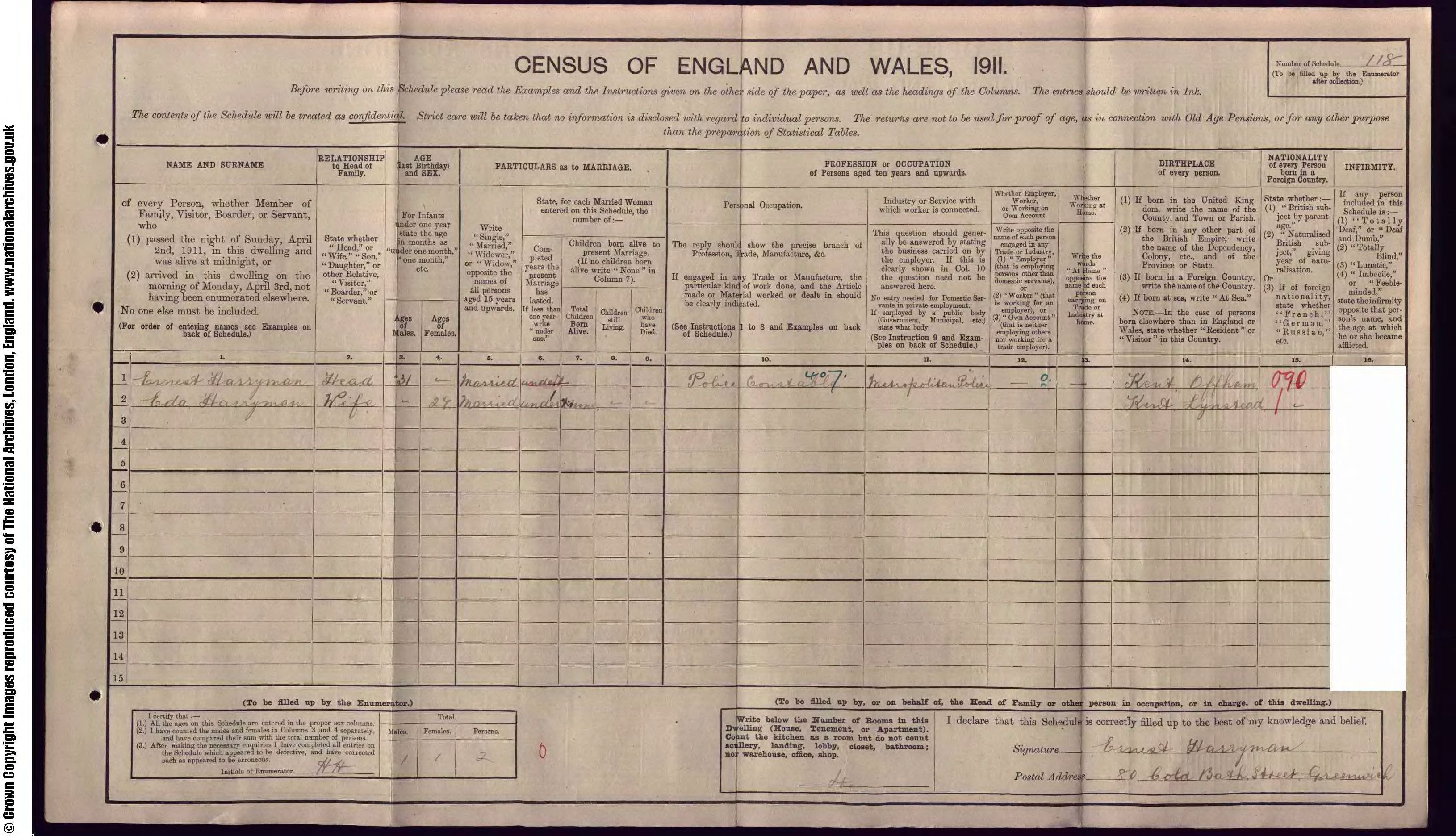 • Occupation: Police Constable, 1911, Greenwich, Kent, England. • Lived at: Ernede - Lunsford Lane, 1939, Malling, Kent, England.