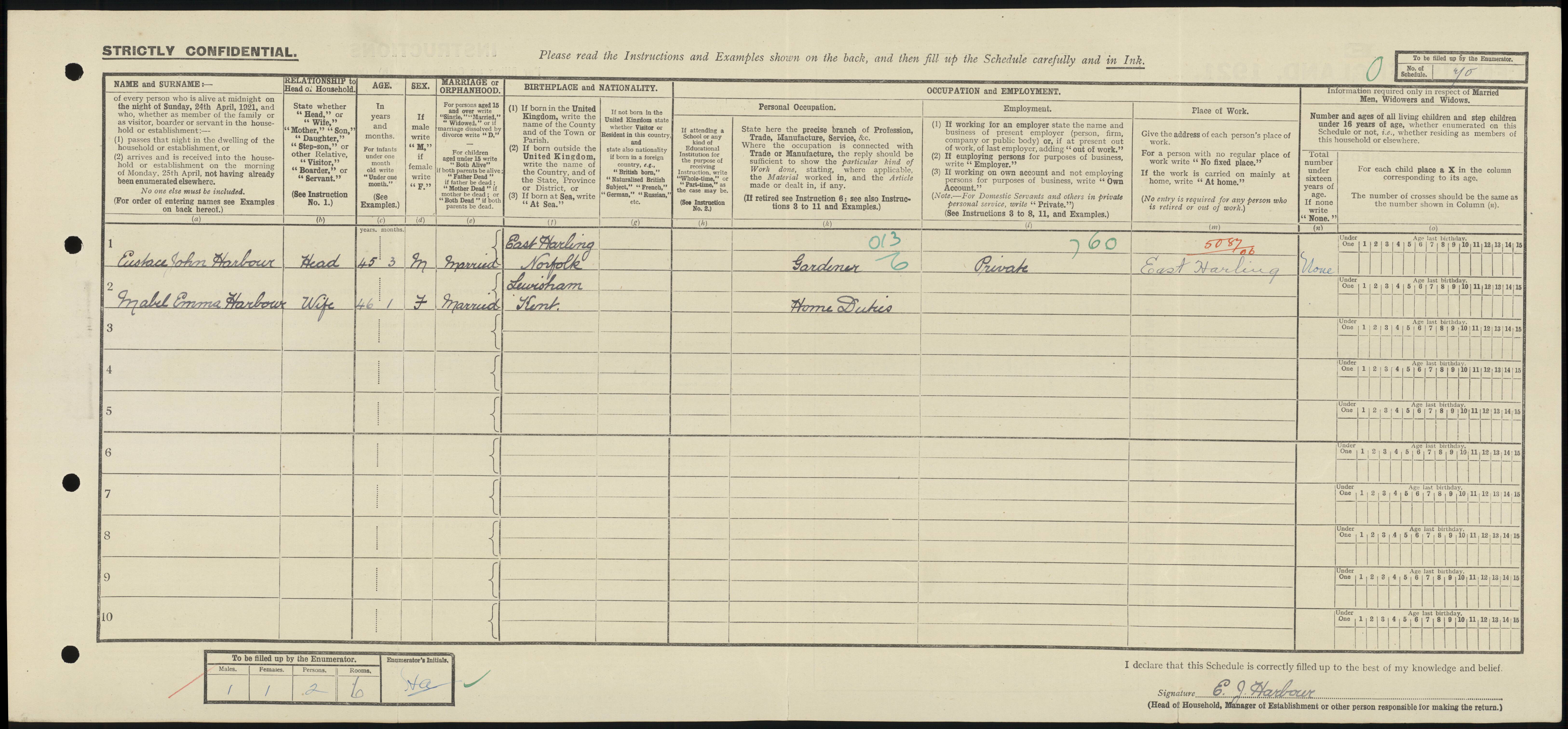 • Lived at: Gallants Lane, 1921, East Harling, Norfolk. Mabel married Eustace John Harbour Dec Q 1900 in Bury Saint Edmunds, Suffolk, England. (Eustace John Harbour was born circa 1874 in East Harling, Norfolk and died on 10 Oct 1957 in Hellesdon Norfolk.) |
