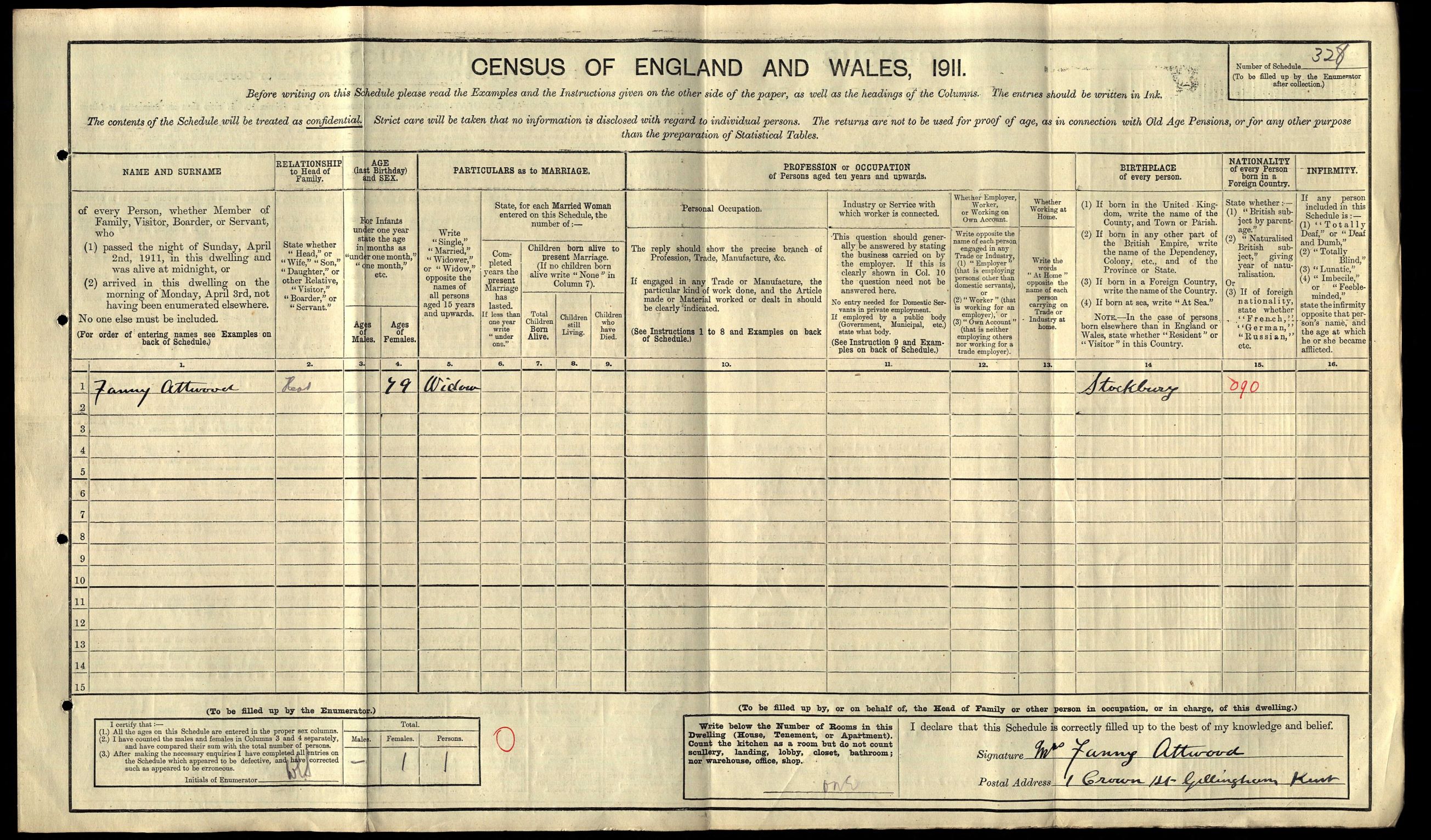 • Lived at: 1 Crown Street, 1911, Gillingham, Kent, England. Fanny married Frederic Attwood on 14 Oct 1856 in Stockbury, Kent, England..1 2 3 (Frederic Attwood was born in 1830 1 3 4 and died Sep Q 1883 in Milton 1.) |