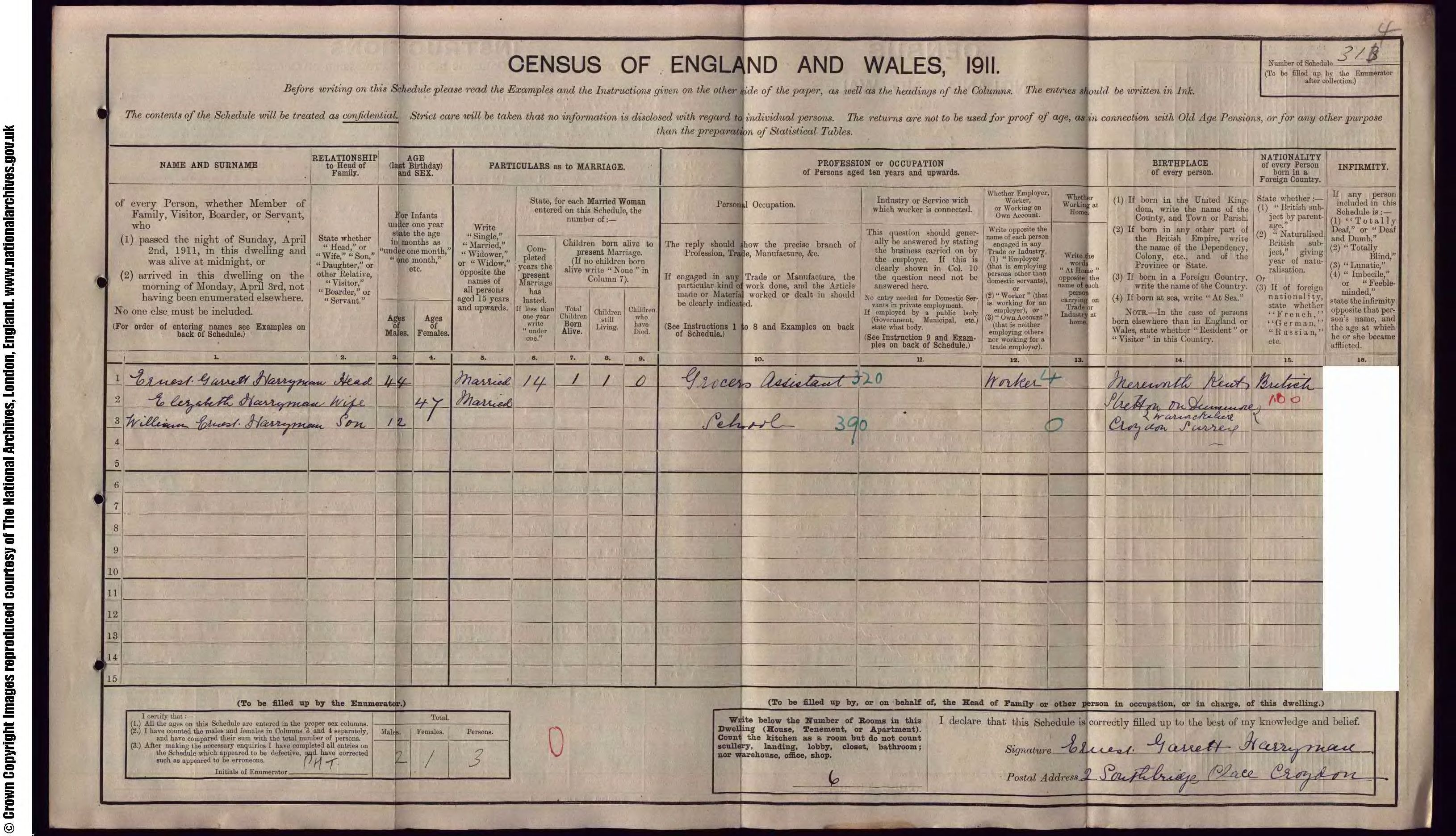 Other names for Ernest were Ernest Garrett Harryman and Ernest James Harryman. Events • Lived at: Kent Street, 1871, Mereworth, Kent, England. 7 • Lived at: Grocer Shop, High Street, 1881, Mereworth, Kent, England. 2 • Occupation: Grocer's Asst, 1881-1891, Mereworth, Kent, England. 2 8 9 • Lived at: 89 High Street, 1891, Croydon, Surrey, England. 9 • Lived at: 19 Brafferton Road, 1901, Croydon, Surrey, England. 10 • Occupation: Grocer's Assitant, 1901-1921, Croydon, Surrey, England. 10 11