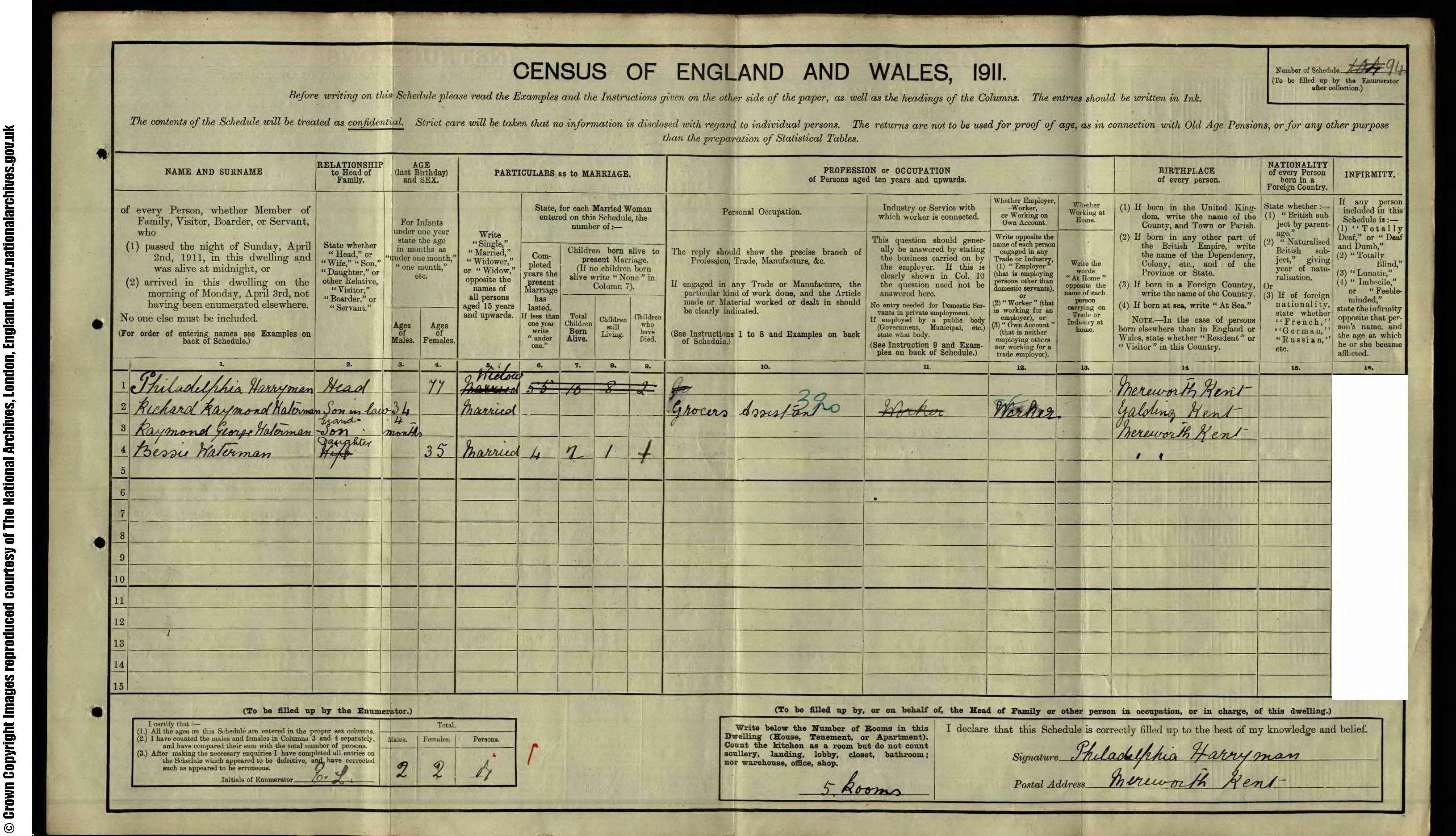 • Lived at: Butcher's Lane, 1921, Mereworth, Kent, England. • Lived at: Bay Tree House, 1939, Malling R.D., Kent, England. Bessie married Richard Raymond Waterman on 9 Jan 1907 in Mereworth, Kent, England. (Richard Raymond Waterman was born on 1 Oct 1877 in Yalding, Kent, England. and died after 1921.) |