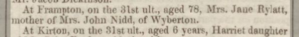 Cause of her death was old Age. Another name for Jane was Sarah. Burial Notes: rFirst name(s) Jane married John Rylatt, son of John Rylott and Mary Fox, on 14 Aug 1792 in Skirbeck, Lincolnshire, England.1 (John Rylatt was born circa 1772, baptized on 6 Jun 1772 in Boston, Lincolnshire, England,3 died on 29 Jun 1843 in Boston, Lincolnshire, England and was buried on 2 Jul 1843 in Boston, Lincolnshire, England.). The cause of his death was Chronic Asthma. |
