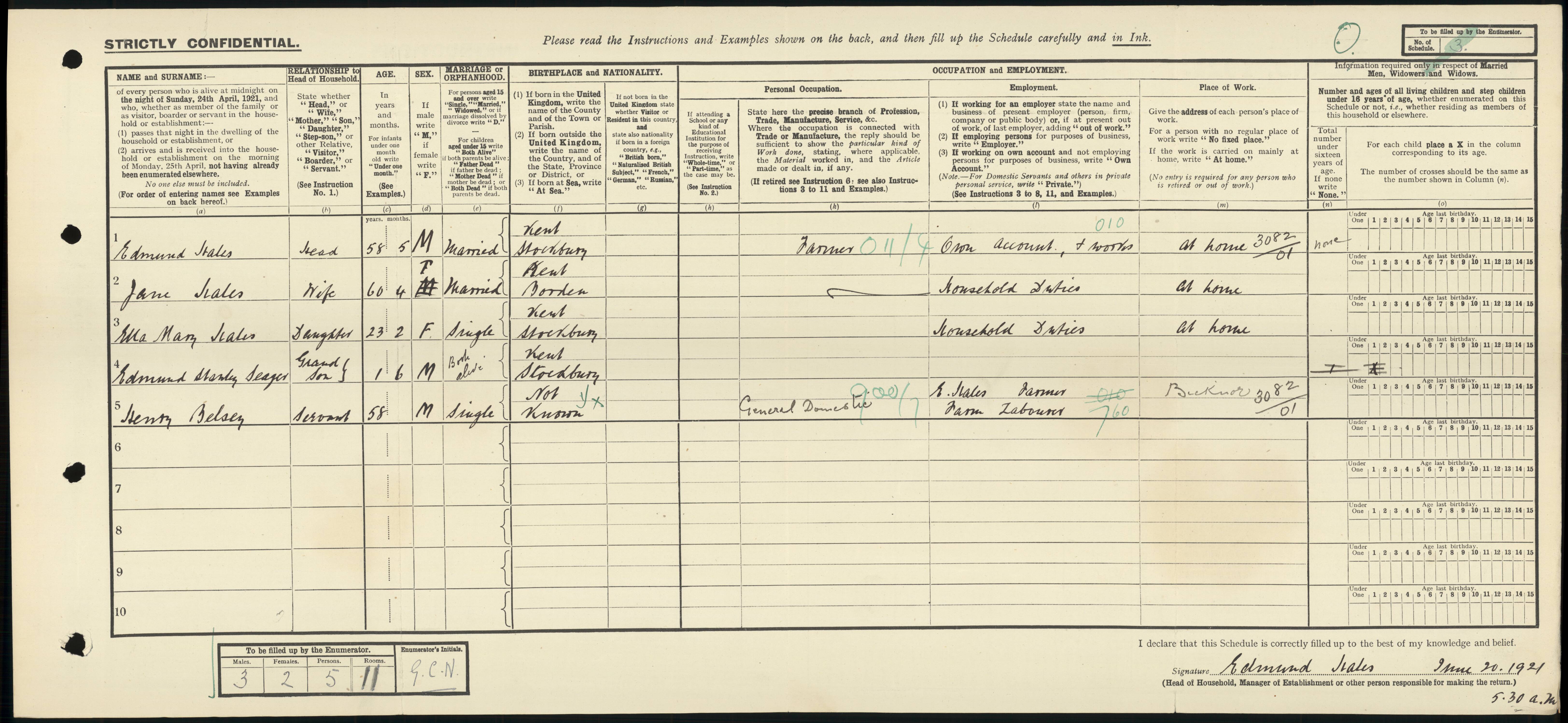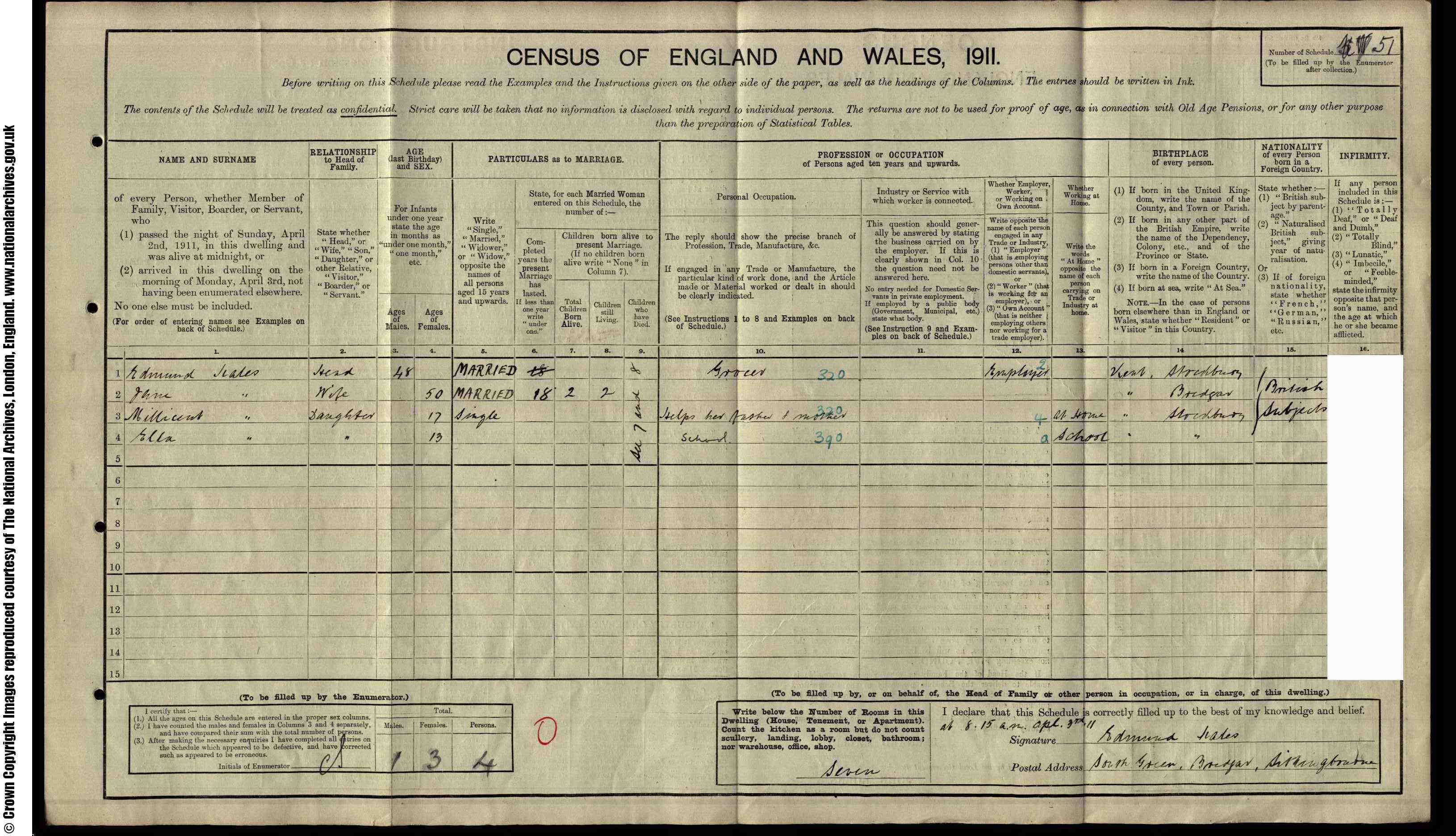 • Occupation: Grocer, 1911, Sittingbourne, Kent, England. • Lived at: Bicknor Court Farm Nr Sittingbourne, 1921, Bicknor, Kent, England.
