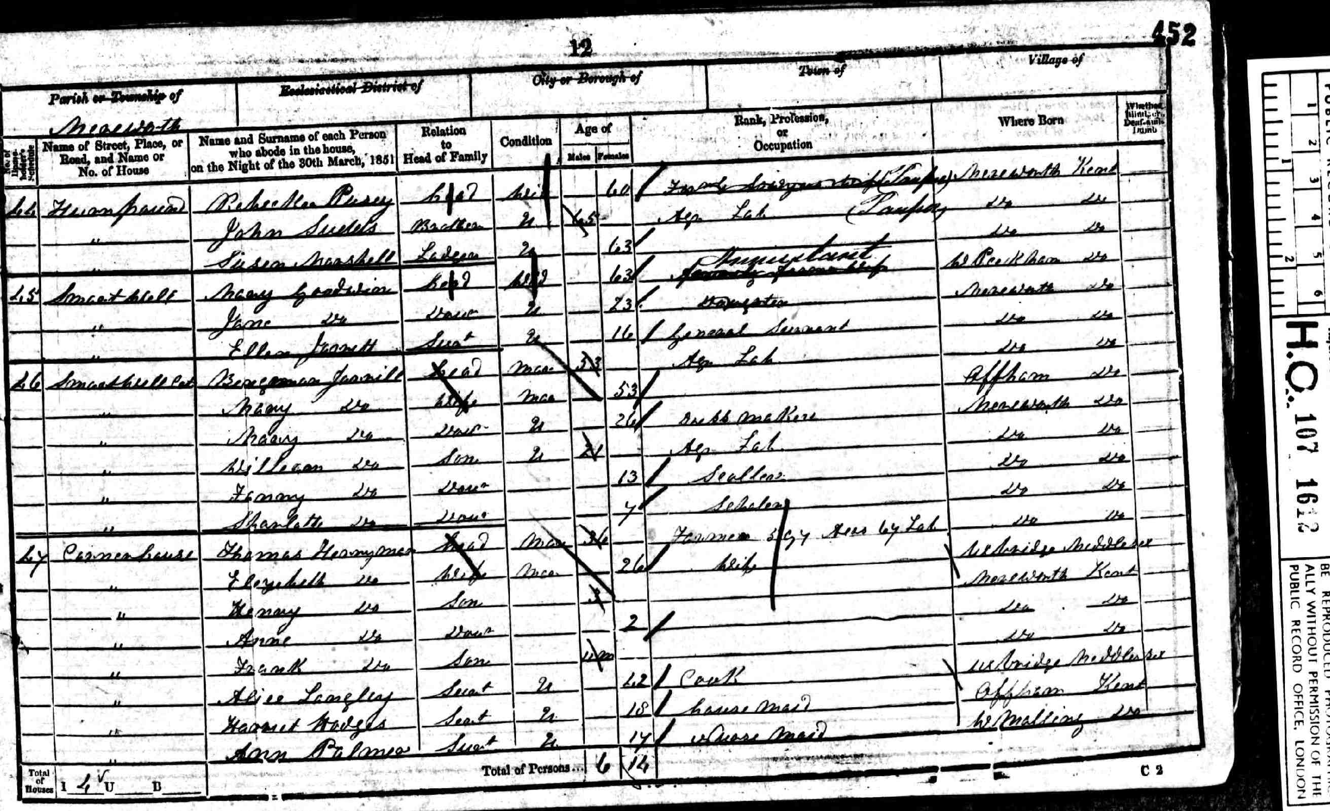 6 Published by Ancestry.co.uk (1851 English and Welsh Census(London, TNA/Ancestry.co.uk, 1952) , Web site showing copies of original enumerator schedules) ID: CEN 1851, CEN 1851 ho 107 1612 452 12. Repository: Call Number: film 0087558. Cit. Date: 8 Oct 2005. Cit. ID: CEN 1851 ho 107 1612 452 12. Surety: 3.