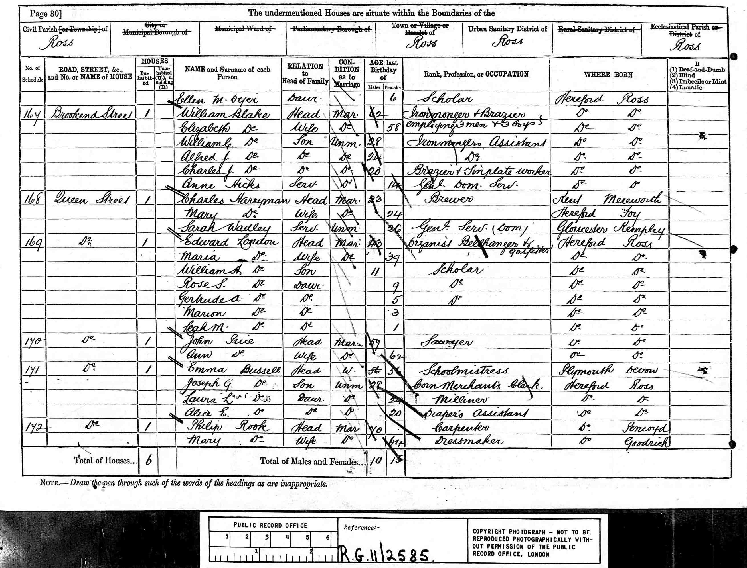 • Lived at: Queen Street, 1881, Ross, Herefordshire, England. 2 8 • Occupation: Brewer, 1881, Ross, Herefordshire, England. 2 8