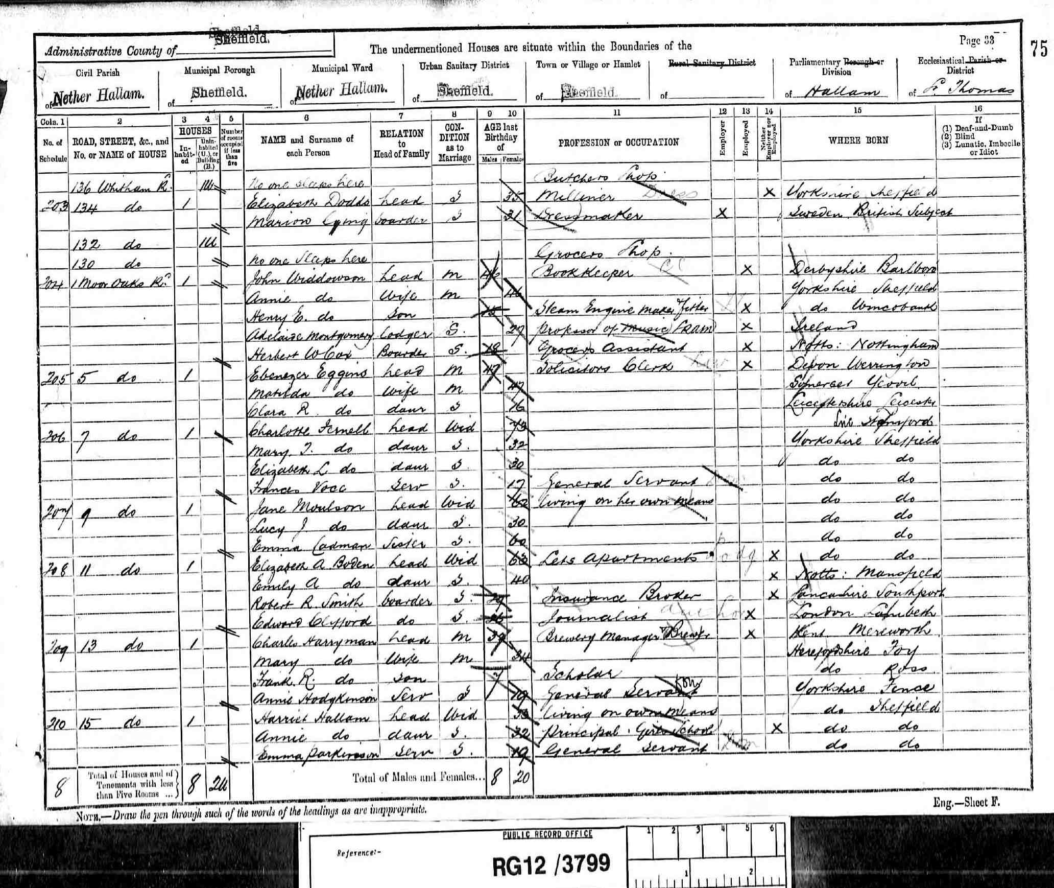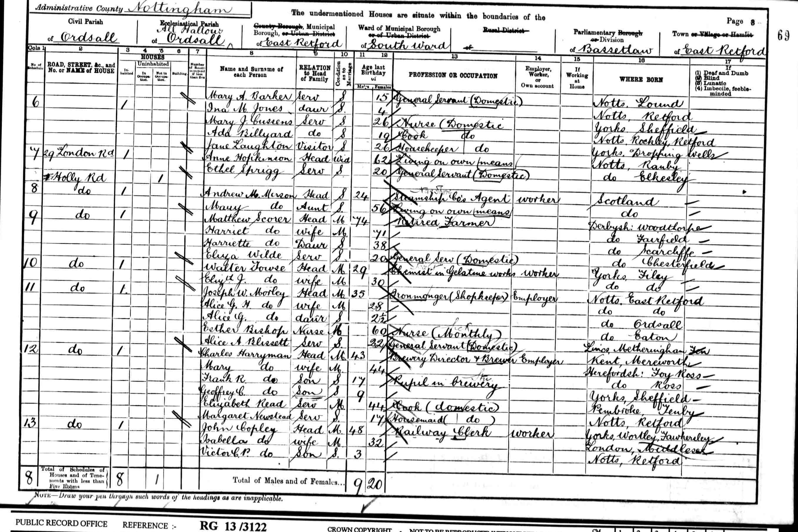 • Lived at: 13 Moor Ouke Road, 1891, Nether Hallam, Yorkshire, England. 2 9 • Occupation: Brewery Manager, 1891, Nether Hallam, Yorkshire, England. 2 9 • Lived at: Holly Road, 1901-1910, Ordsall, Nottinghamshire, England. 10 11