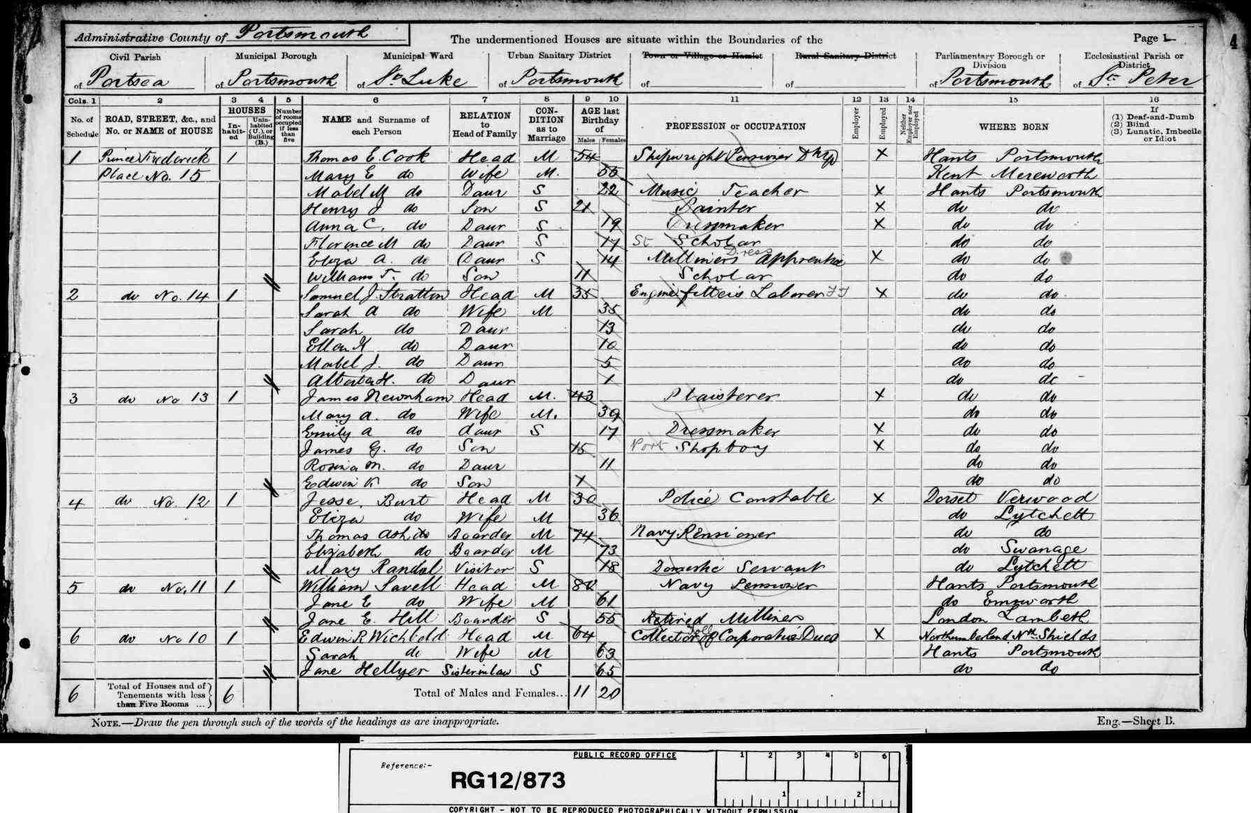 • Lived at: 15 Prince Frederick Place, 1891, Portsea.