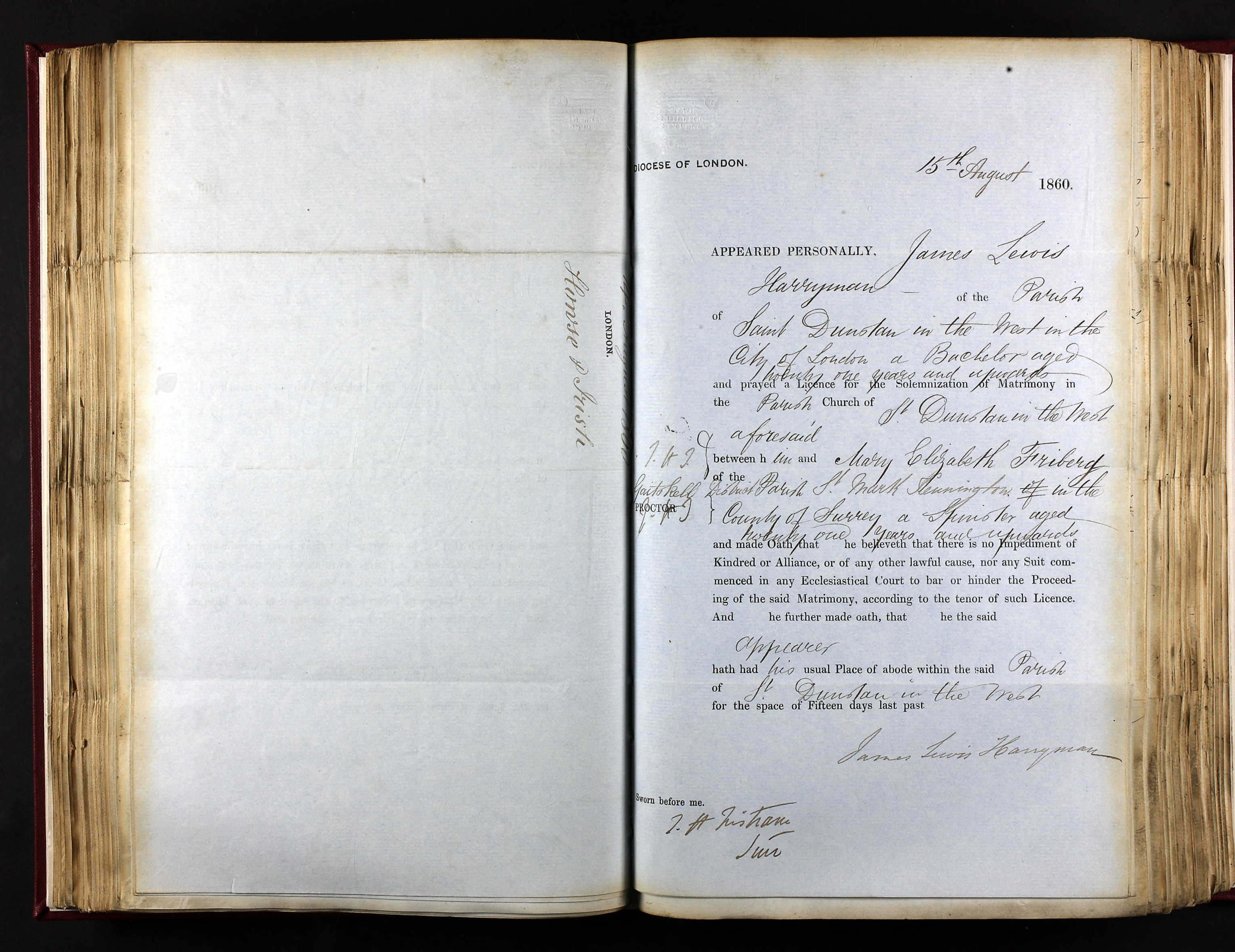 • Marriage Bonds: between James Lewis Harryman and Mary Elizabeth Friberg, 15 Aug 1860, St.Dunstan in the west, Surrey.