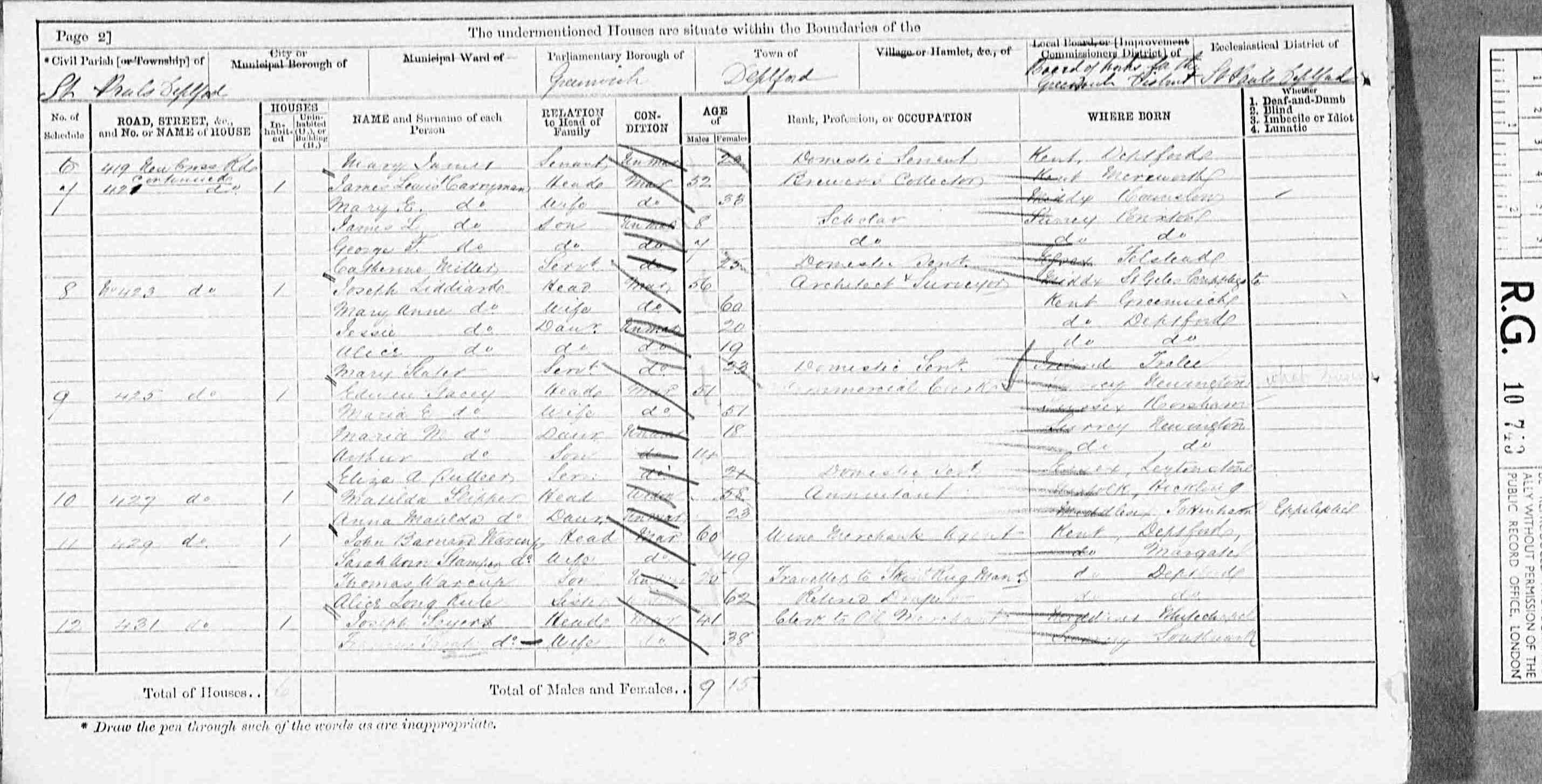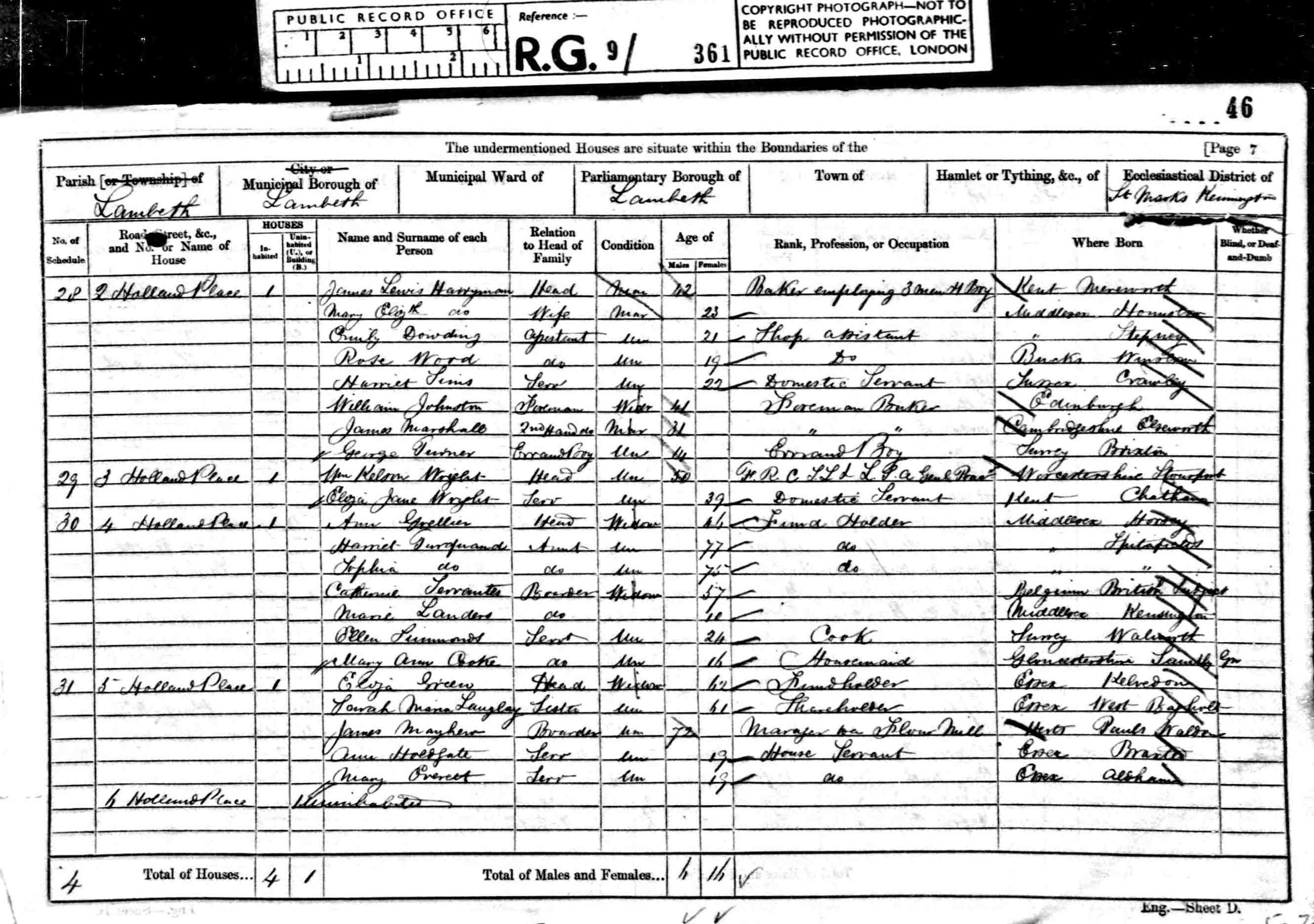 • Lived at: 2 Holland Place, 1861-1865, Lambeth, London, England. 2 • Occupation: Baker employing 3 men and a boy, 1861, Kensington, London, England. 2 • Executor: to his brother George's estate, 1865. • Occupation: Brewers Collector, 1865-1871, St Paul, Deptford, London, England. 7