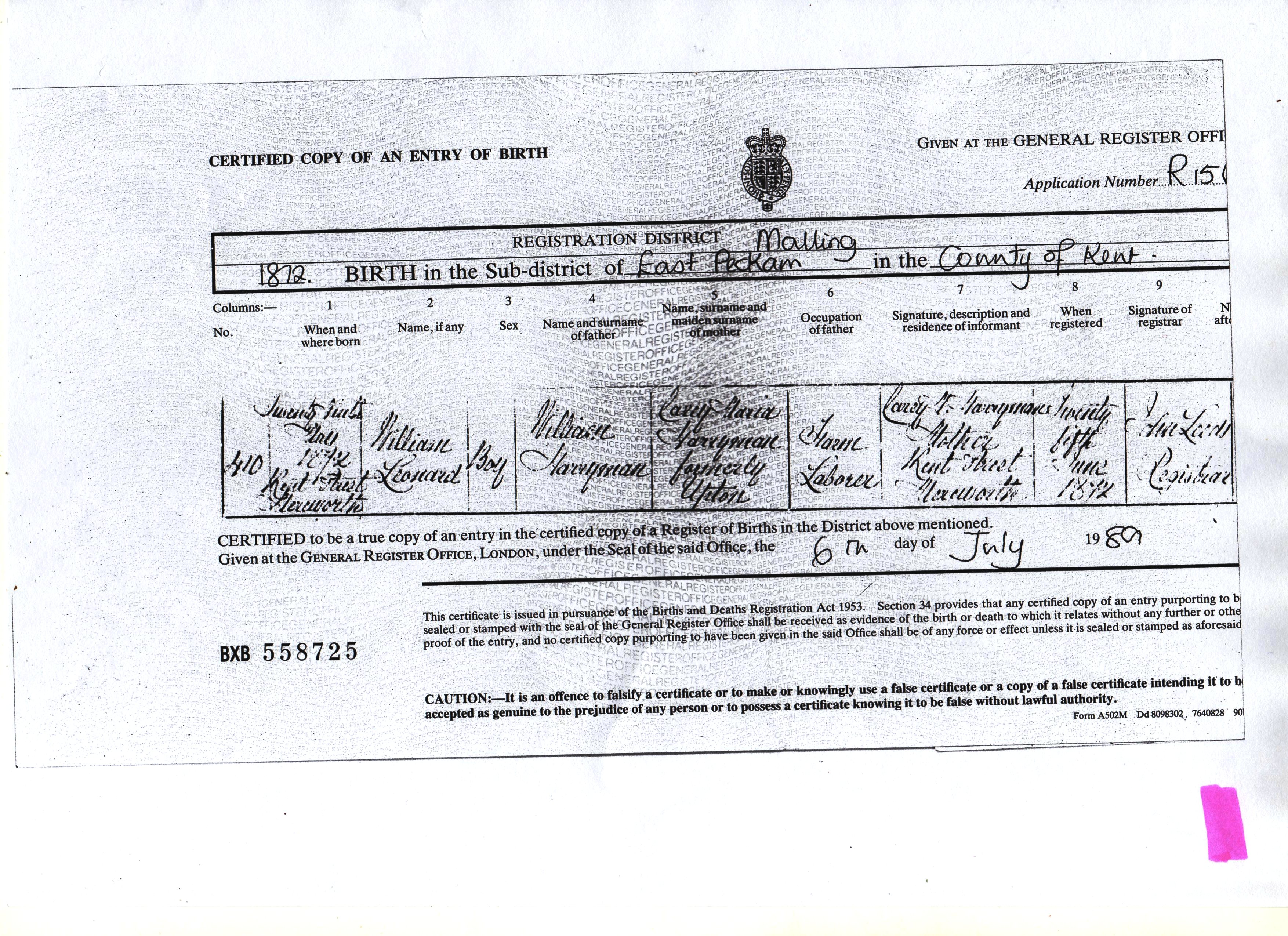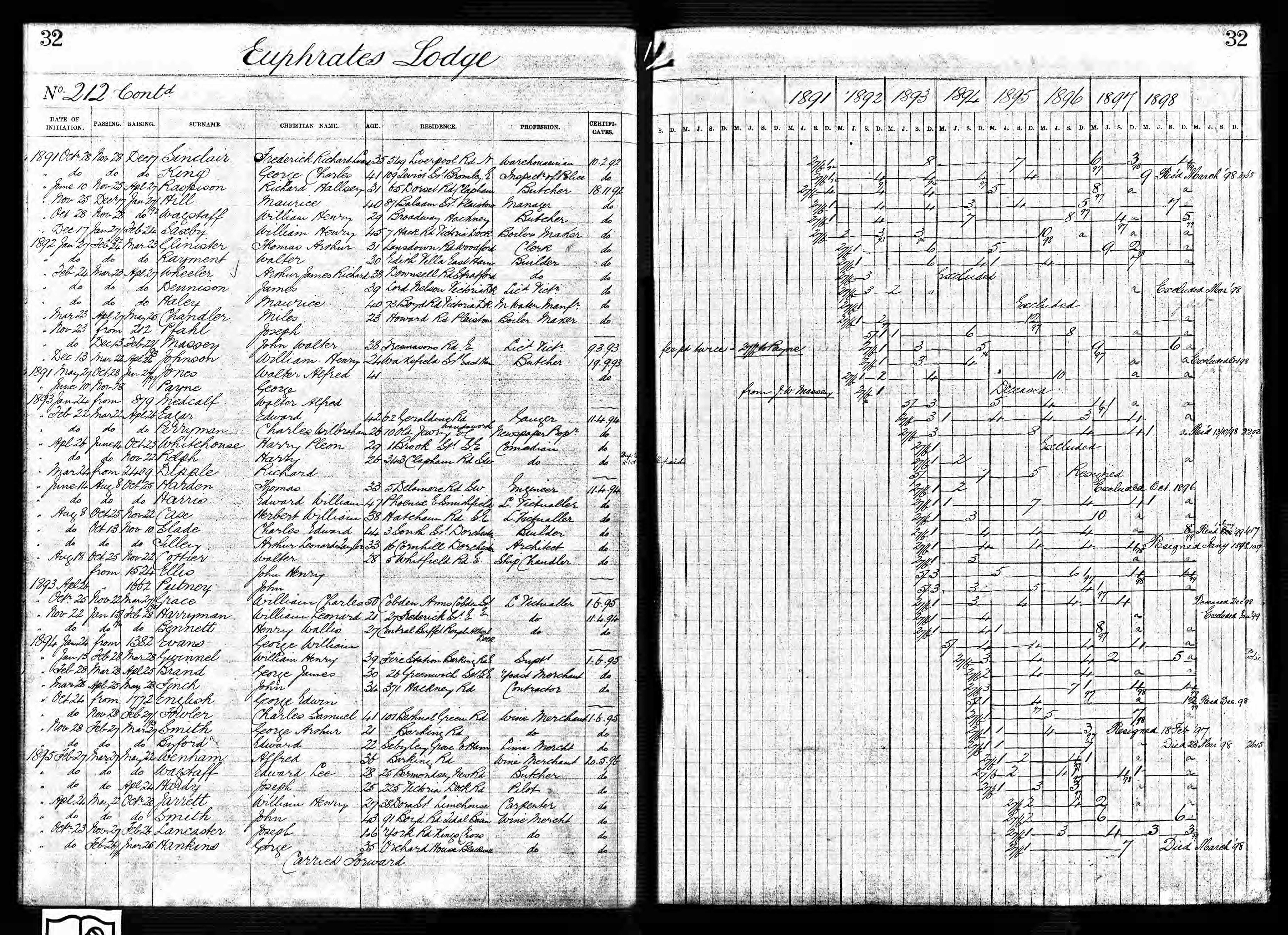 • Lived at: Kent Street, 1872, Mereworth, Kent, England. 7 • Lived at: High Street, 1881, Wrotham, Kent, England. 8 • Lived at: 27 Frederick Street, 1891-1898, West Ham, London. 2 9 • Occupation: Barman, 1891, West Ham, London. • Membership: Freemason, 1893, Euphrates Lodge. • Occupation: Beer Retailer Pub, 1901, West Ham, London. 6 10