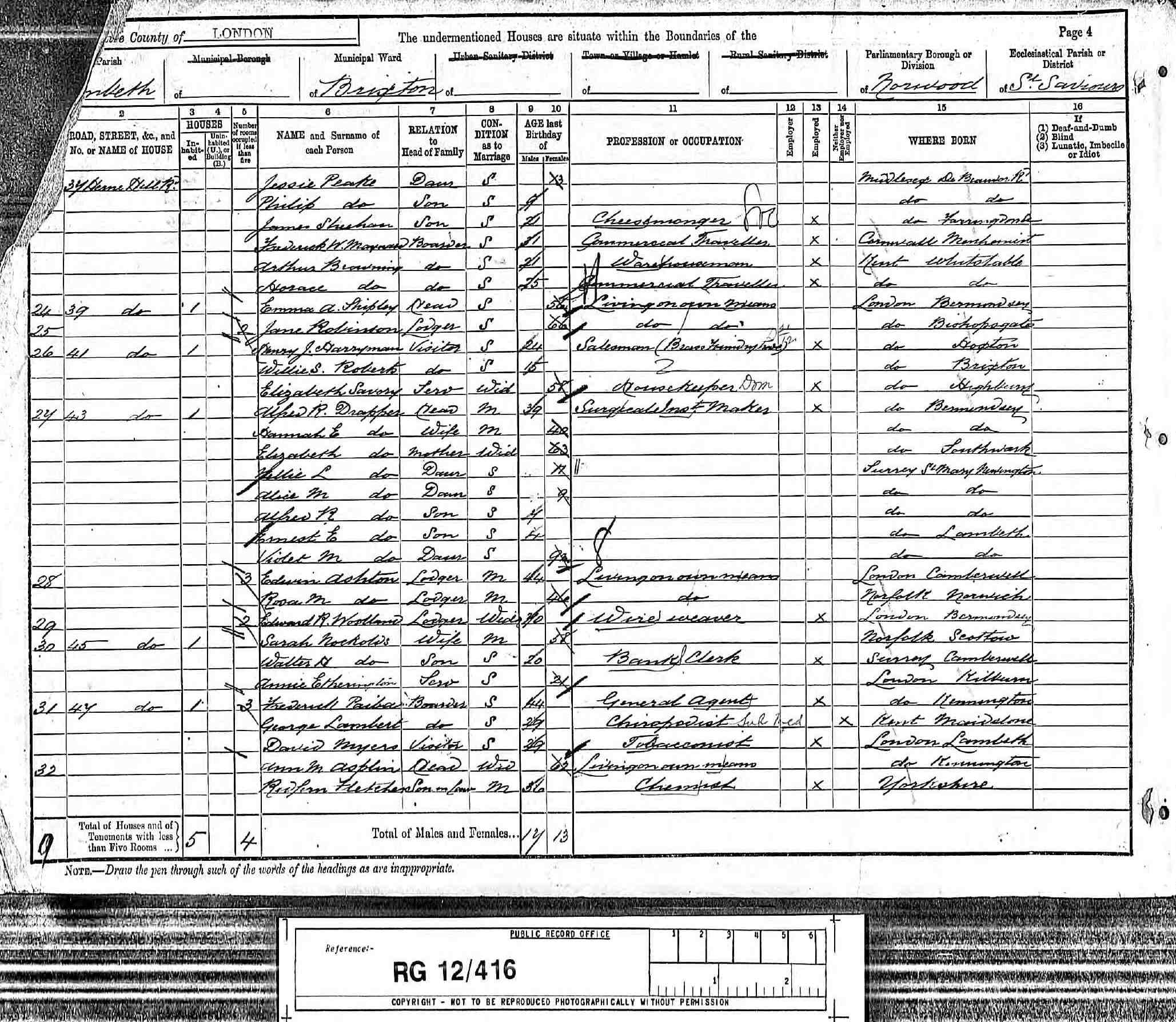 • Lived at: 41 Herne Hills Road, 1891, Brixton, Surrey, England. 4 • Occupation: Salesman, 1891, Brixton, Surrey, England. 4 • Convicted: stealing 7 rugs, 1896, Marylebone, London.