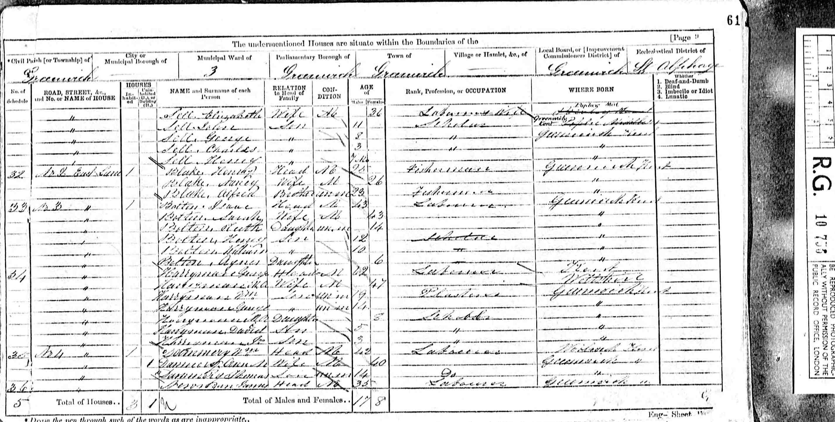 • Lived at: 3 East Lane, 1871, Greenwich, Kent, England. 5 • Occupation: Plasterer, 1871, Greenwich, Kent, England. 5