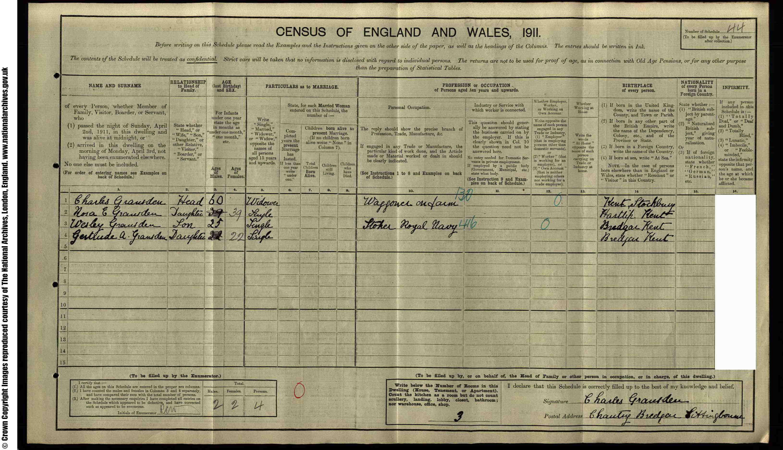 1901 census of England, Kent, Bredgar, folio 62, page 12, Charles Gransden and family; digital images, Ancestry, Ancestry.co.uk (www.ancestry.co.uk : accessed 22 Feb 2009); citing PRO RG 13/807. Cit. Date: 22 Feb 2009. Surety: 3.