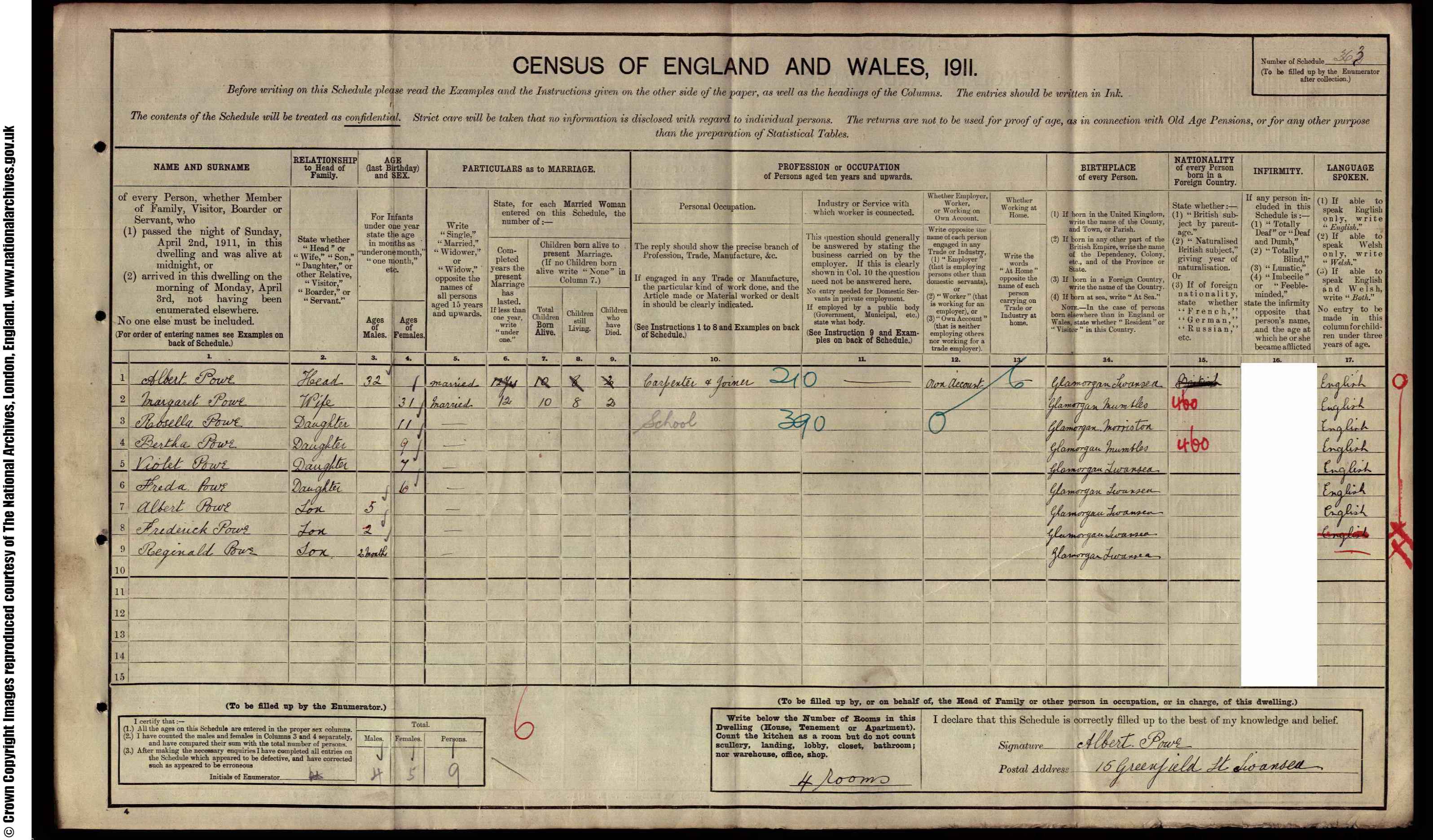 • Lived at: 15 Greenfield Street, 1911-1921, Swansea, Glamorgan, Wales.