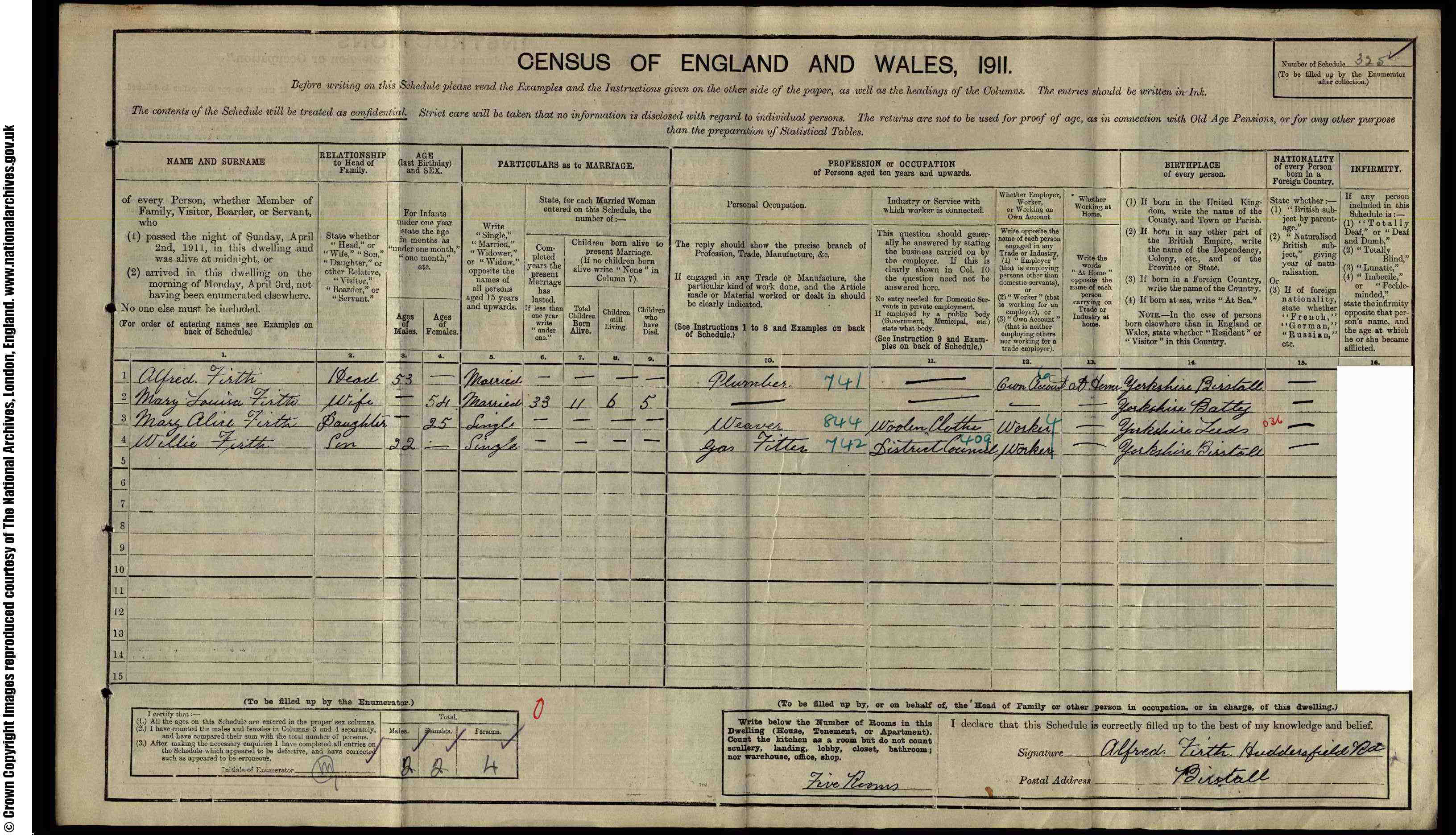 1 1901 census of England, Yorkshire, St. Saviours, Birstall, page 84, Alfred and Mary Louisa Firth; digital images, Ancestry, Ancestry (www.ancestry.co.uk : accessed 18 Jan 2009); citing PRO RG 13 4529 page 34/4259. Cit. Date: 18 Jan 2009. Surety: 3.