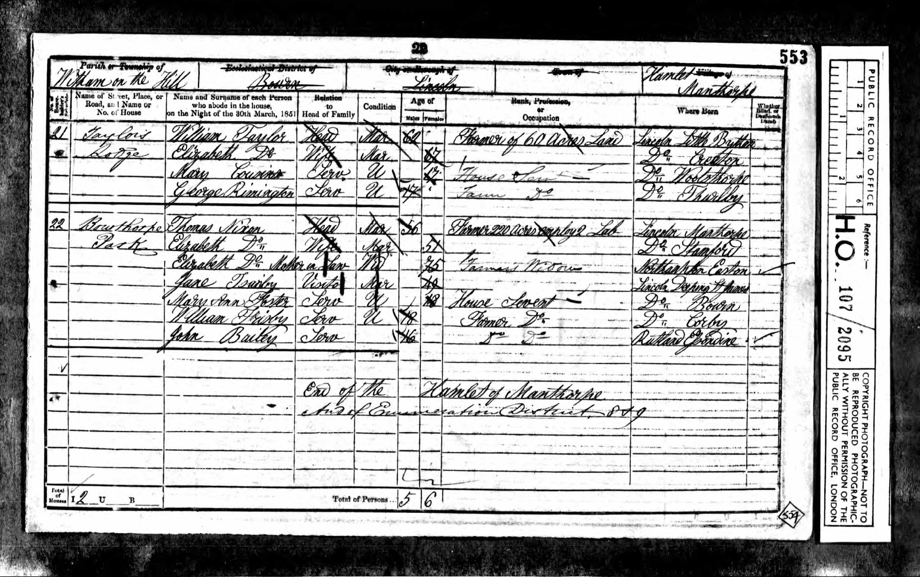 • Lived at: Taylors Lodge, 1851, Witham on Hill, Lincolnshire. • Lived at: Private House, 1861, Bourne, Lincolnshire, England. Elizabeth married William Taylor on 18 Feb 1817 in Witham on Hill, Lincolnshire. (William Taylor was born circa 1797 in Witham on Hill, Lincolnshire and died after 1861.) |
