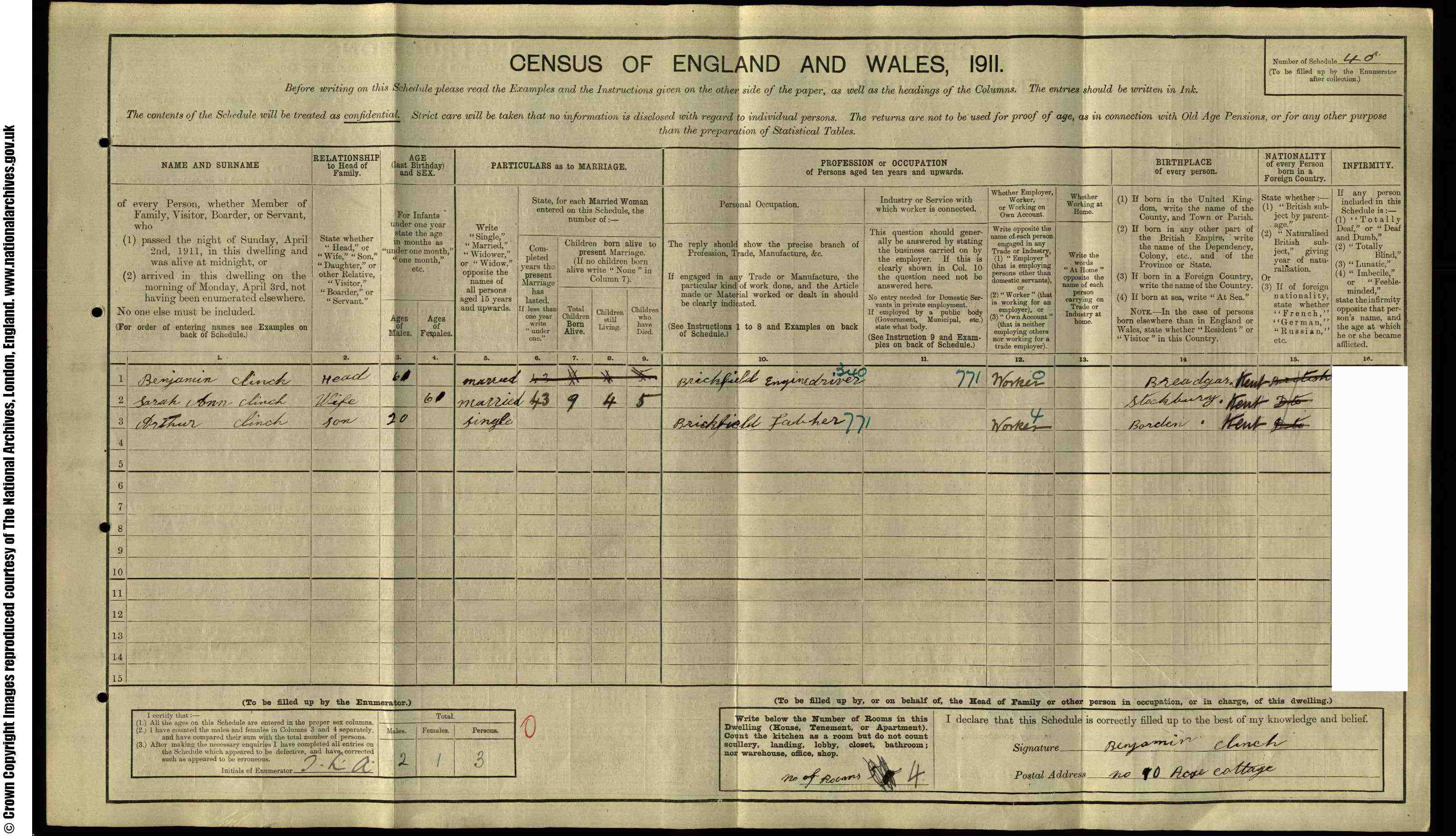 • Lived at: Isandula Cottage, Green Street, 1911, Lynsted, Kent, England. • Occupation: Brickfield Engine Driver, 1911, Lynsted, Sittingbourne, Kent.