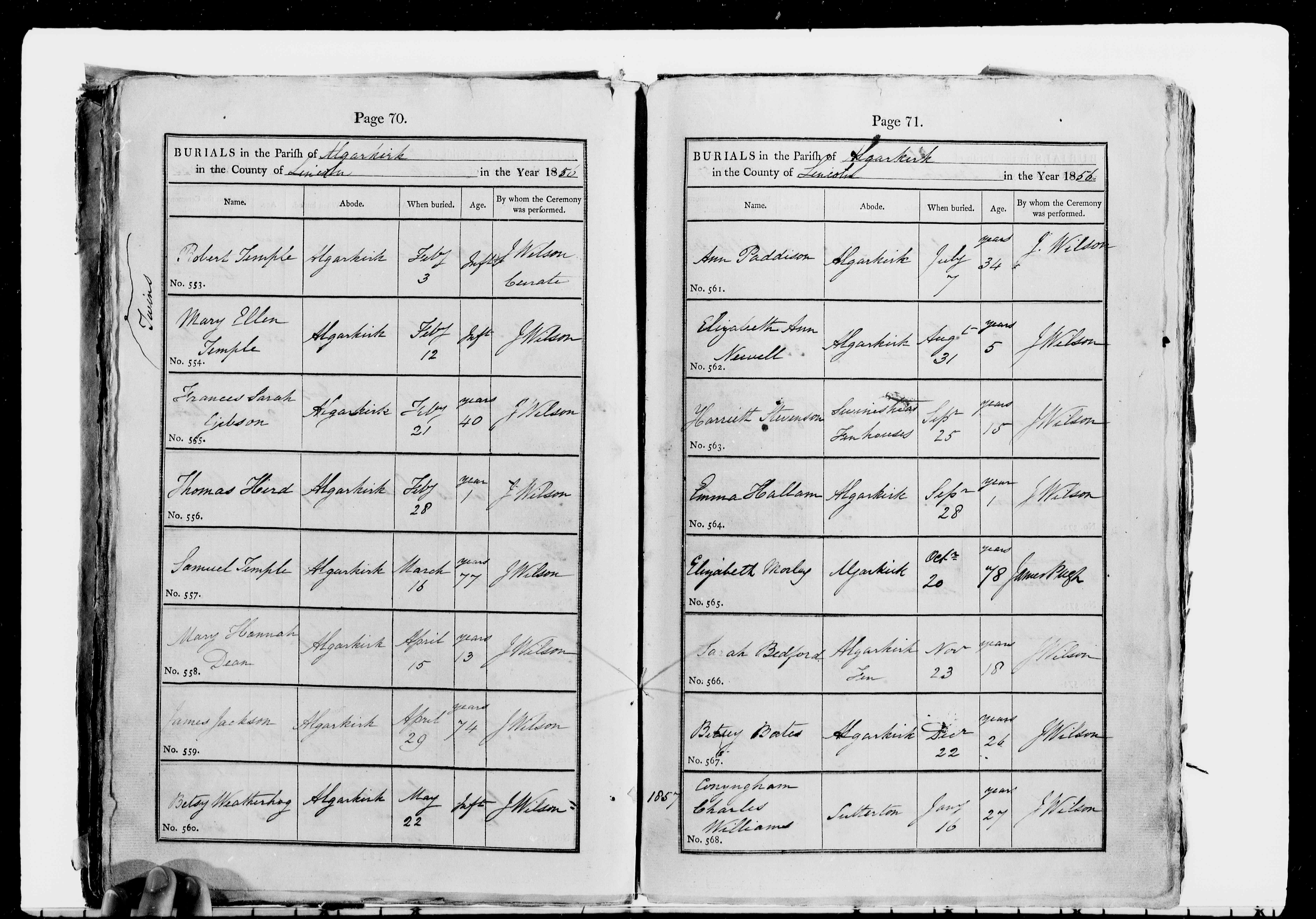 First name(s): Samuel Last name: TEMPLE Date of burial: 16 Mar 1856 Age at death: 77 Calculated year of birth: 1779 Place of burial: Algarkirk Dedication: St Peter & St Paul County: Lincolnshire Notes: Algarkirk St Peter & St Paul: Denomination: Anglican Coverage: 1813 - 1900 Number of entries: 1,032 Data provider: Lincolnshire Family History Society