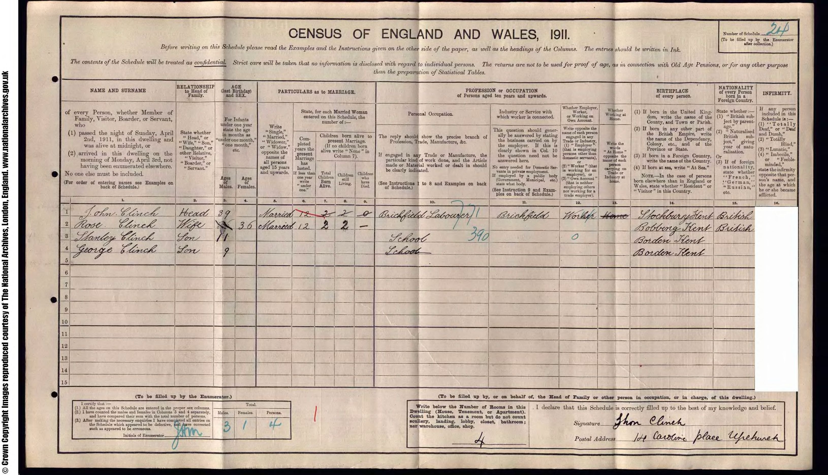1901 census of England, Kent, Borden, folio 33, page 9, George and Rhoda Clinch and John and Rose; digital images, Ancestry, Ancestry.co.uk (www.ancestry.co.uk : accessed 22 Feb 2009); citing PRO RG 13/807. Cit. Date: 22 Feb 2009. Surety: 4.