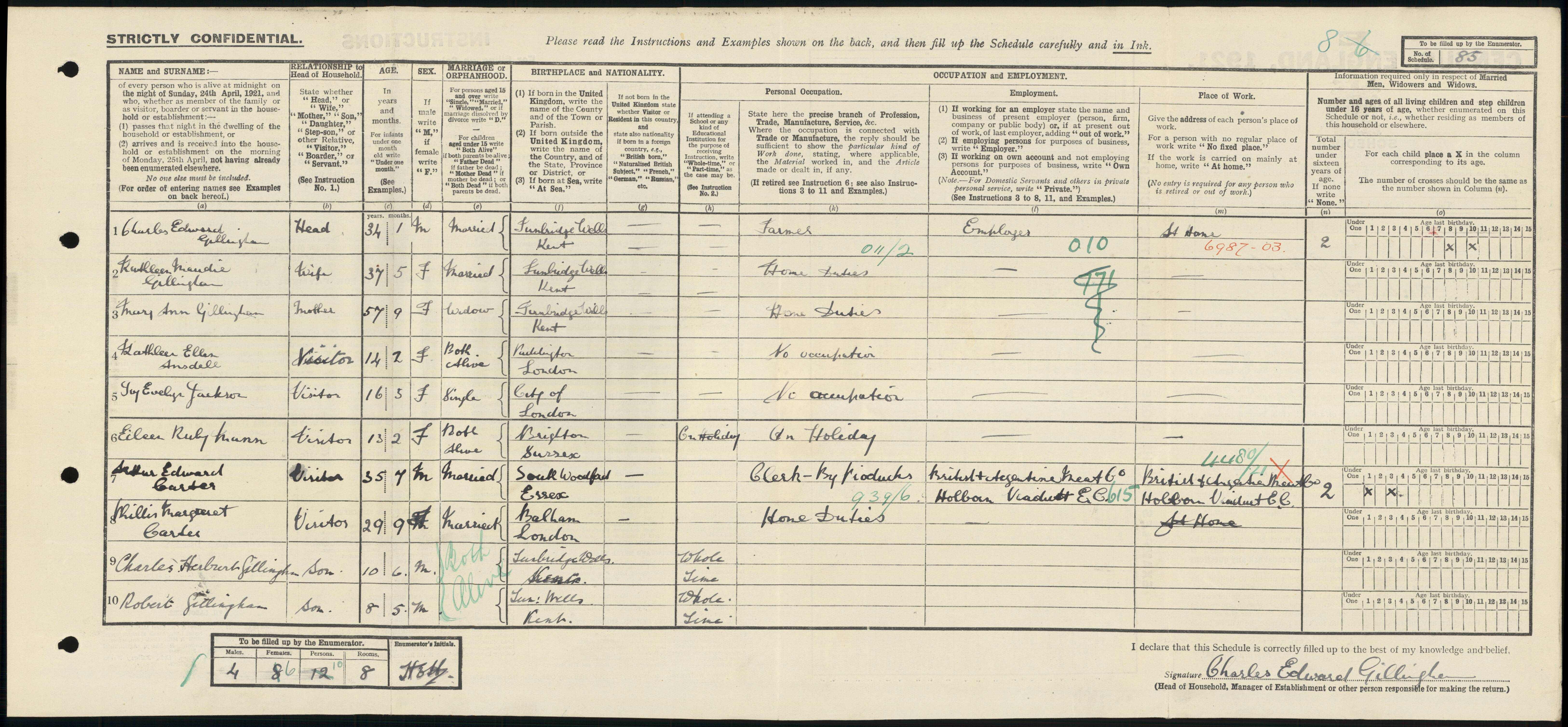 • Lived at: Borders Farm, 1921, Etchingham, Sussex, England. Kathleen married Charles Edward Gillingham Dec Q 1910 in Tonbridge Wells, Kent, England. (Charles Edward Gillingham was born on 23 May 1887 and died Jun Q 1970 in Battle, Sussex.) |