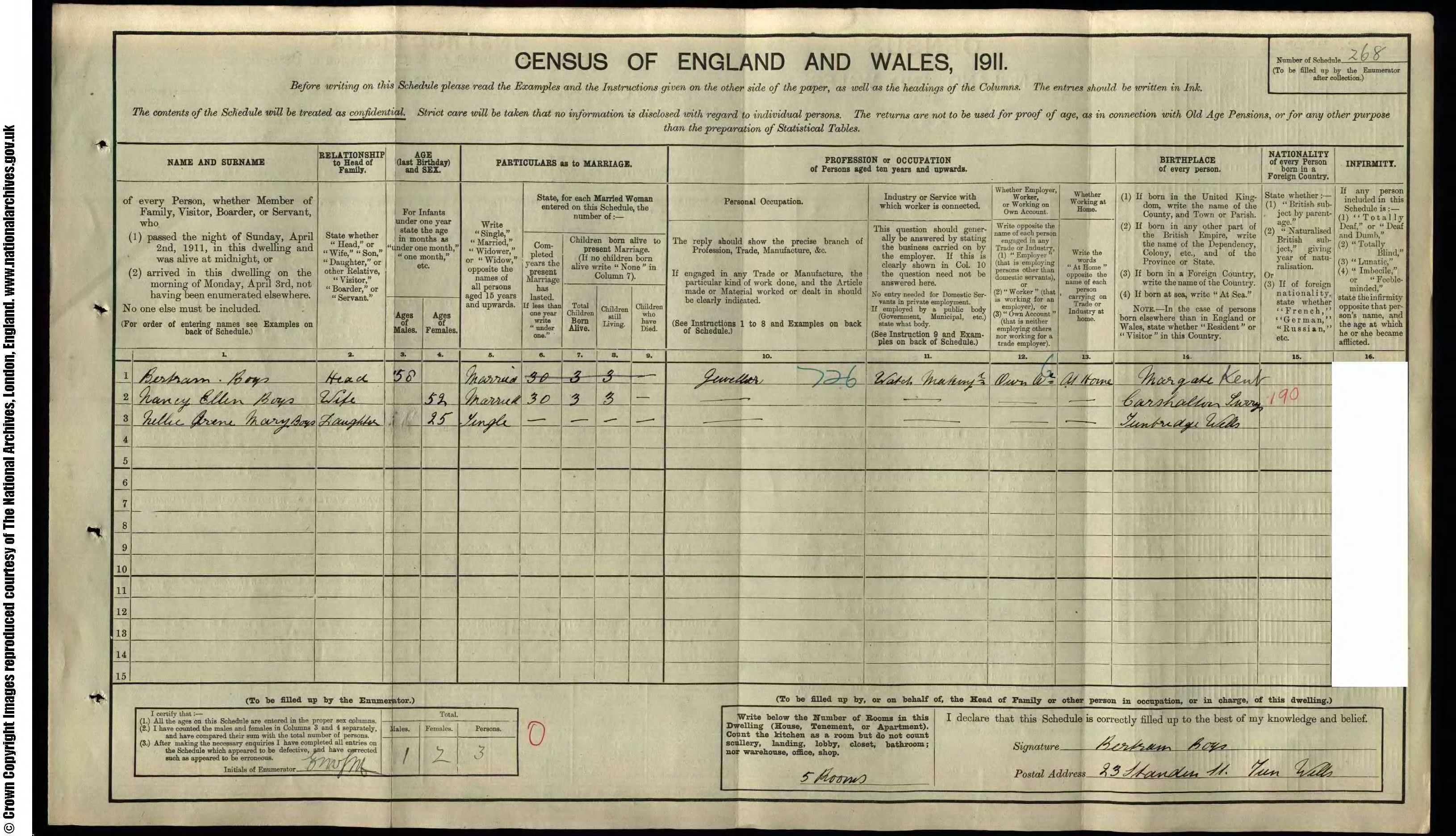 1901 census of England, Kent, Tunbridge, folio 56, page 5, Bertram and Nancy Boys; digital images, Ancestry, Ancestry.co.uk (www.ancestry.co.uk : accessed 23 Feb 2009); citing PRO RG 13/754. Cit. Date: 23 Feb 2009. Surety: 4.