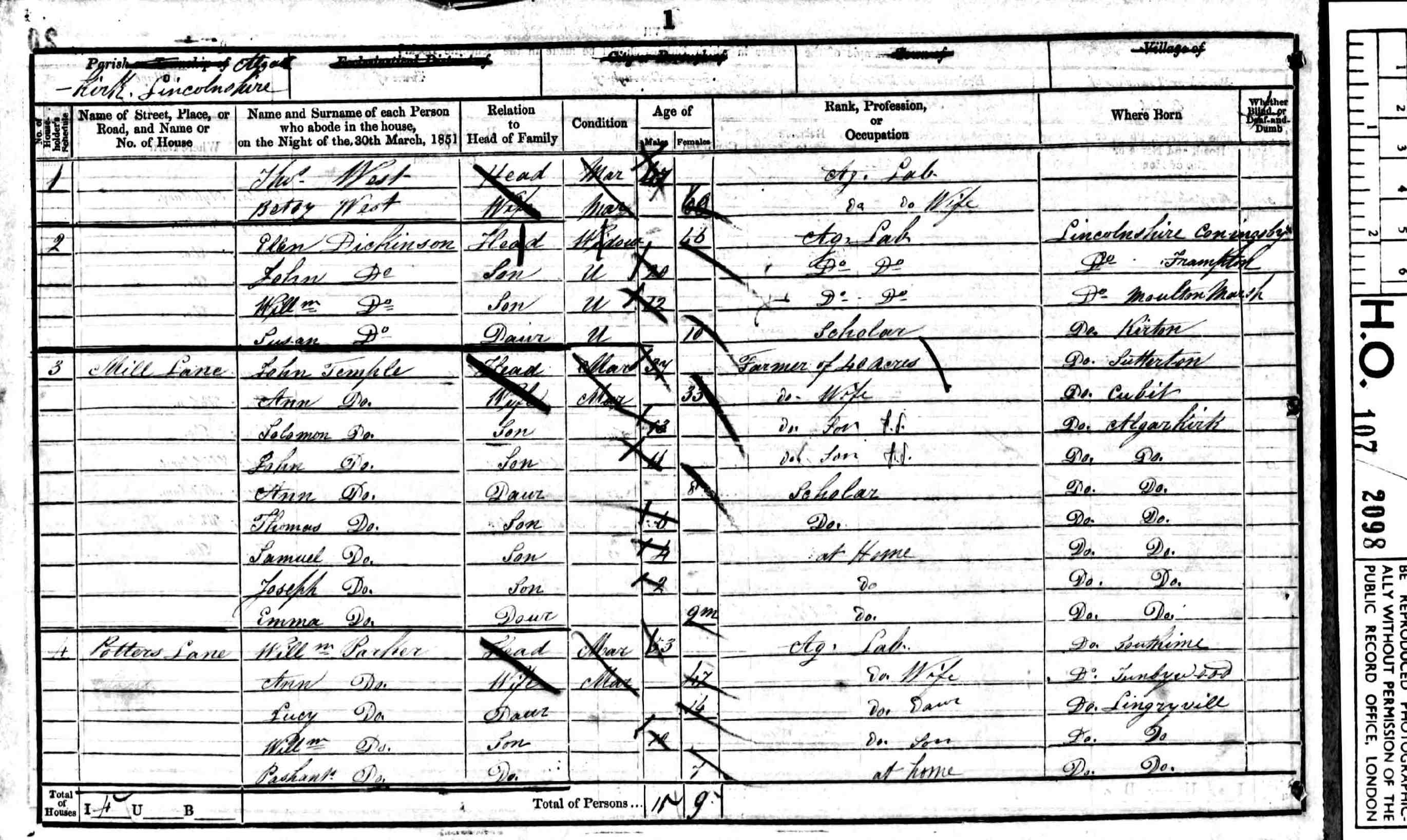 7 1901 census of England, Lincolnshire, Holbeach, page 12112, Thomas and Georgina Temple and family; digital images, Ancestry, Ancestry.co.uk (www.ancestry.co.uk : accessed 24 Feb 2009); citing PRO RG 13/3039. Cit. Date: 24 Feb 2009. Surety: 4.
