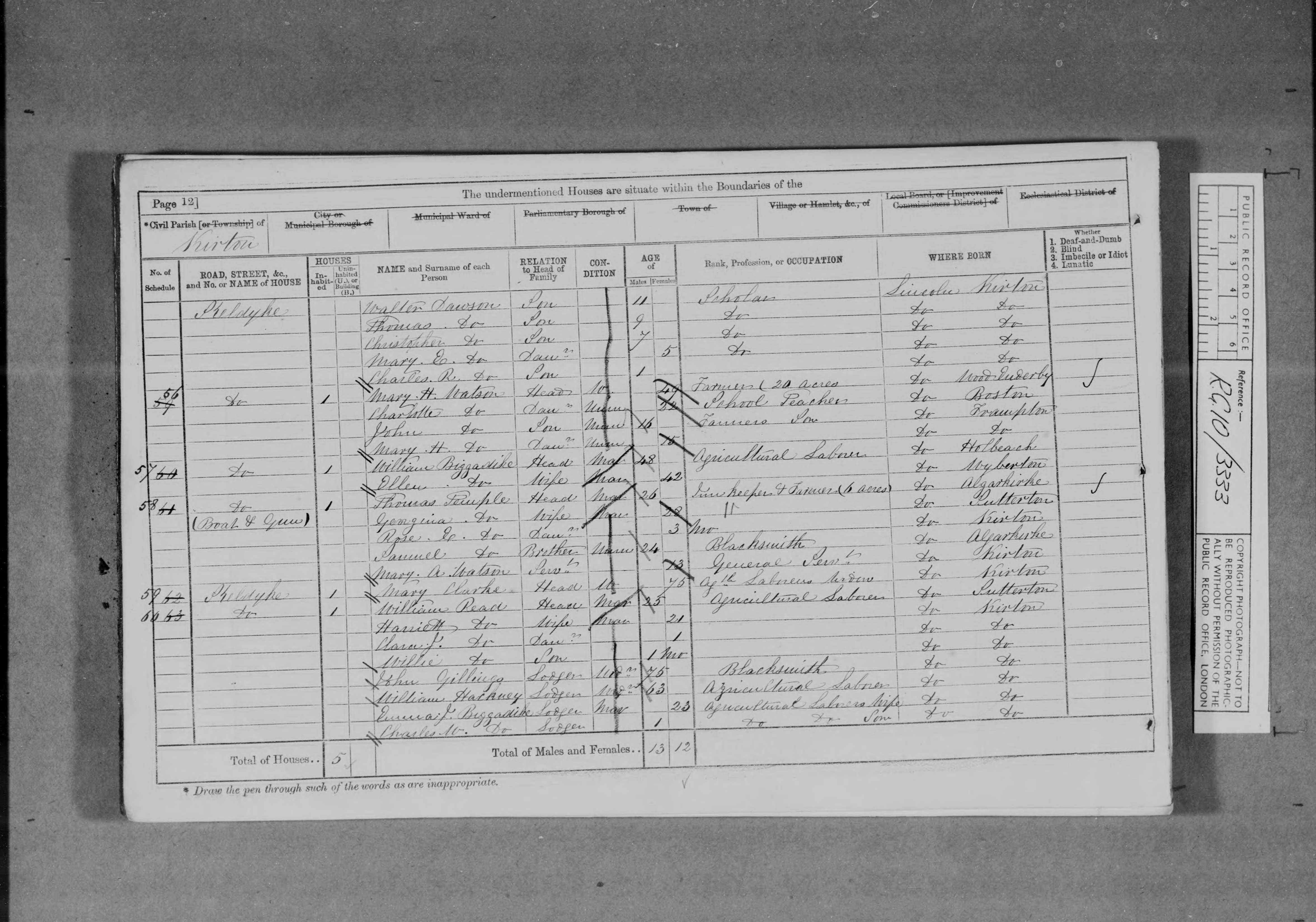 5 (1871 English and Welsh Census(London, TNA/Ancestry.co.uk, 1972) , Web site showing copies of original enumerator schedules) ID: CEN 1871, CEN 1871 rg10 3333 page 12. Repository: Not Given. Cit. Date: 13 Nov 2005. Cit. ID: CEN 1871 rg10 3333 page 12. Surety: 3.