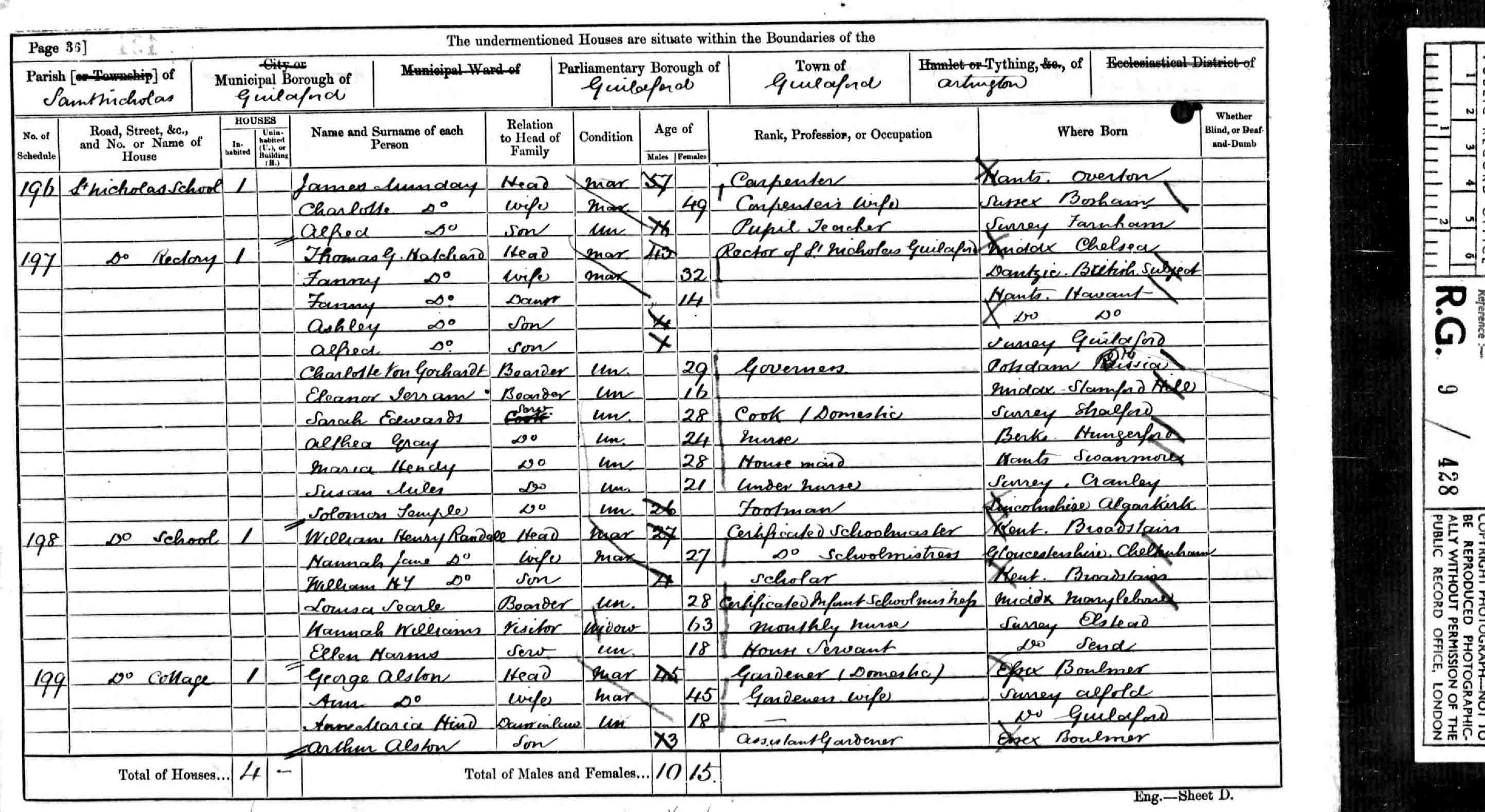 • Occupation: Footman, 1861, Guildford, Surrey, England. 1 5 • Lived at: St. Nicholas Rectory, 1861, Guildford, Surrey, England. 1 5