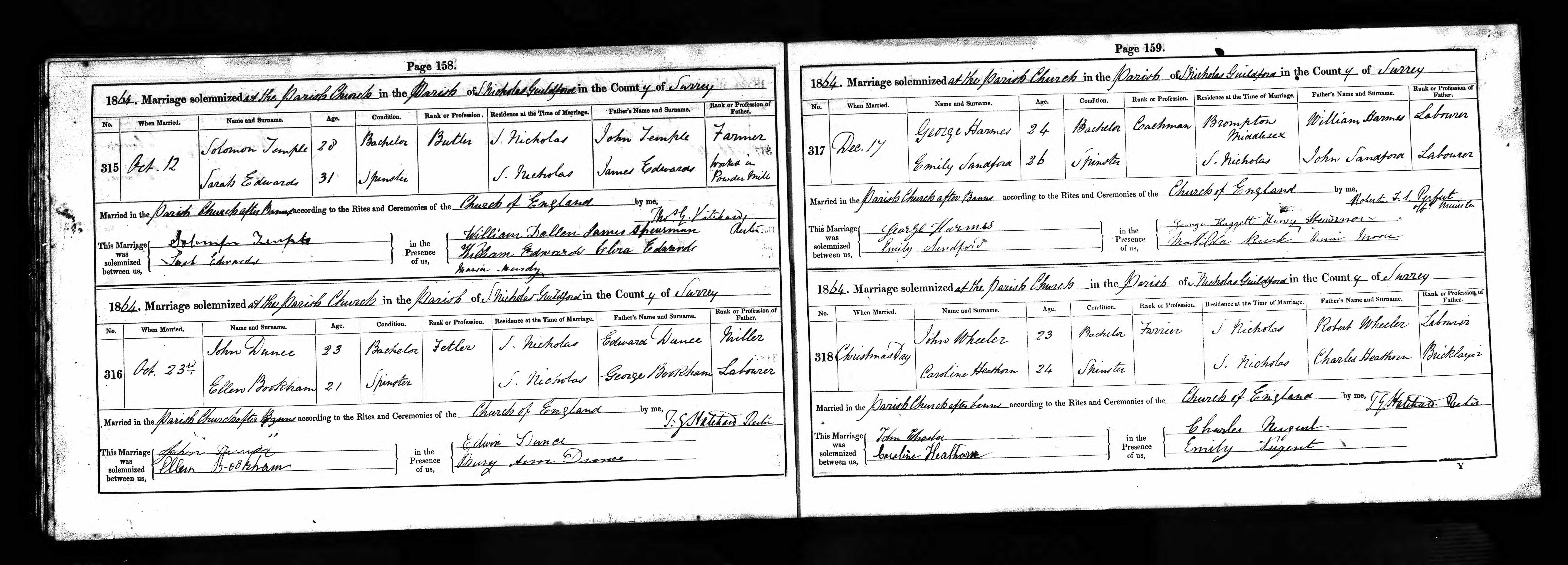 • Marriage Image: Parish Records, 1864, Guildford, Surrey, England. • Occupation: Butler, 1864, London.