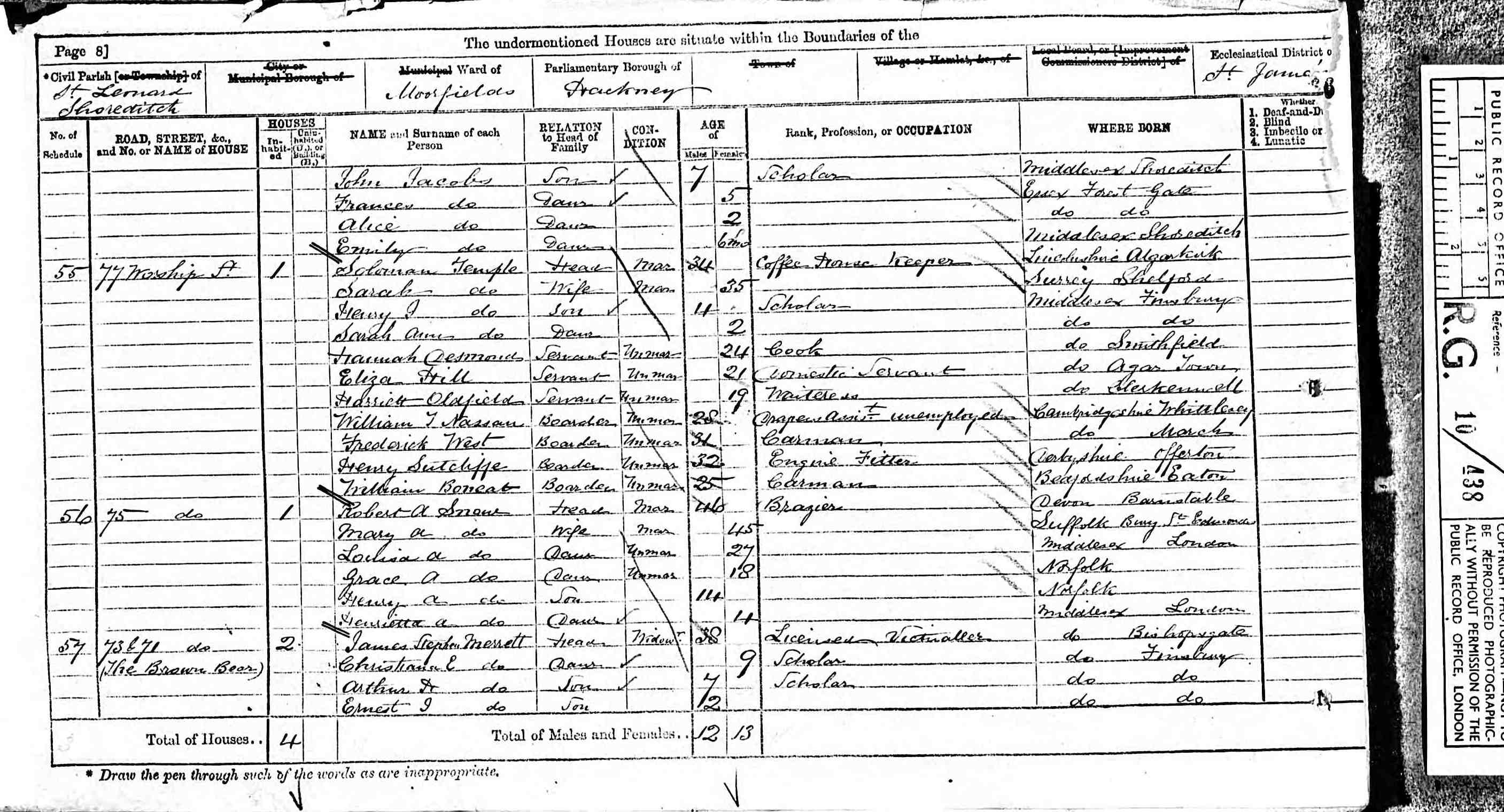 • Lived at: 77 Worship Road, 1871, Holywell, London. 6 • Occupation: Coffee House Keeper, 1871, Hollywell, London. 6
