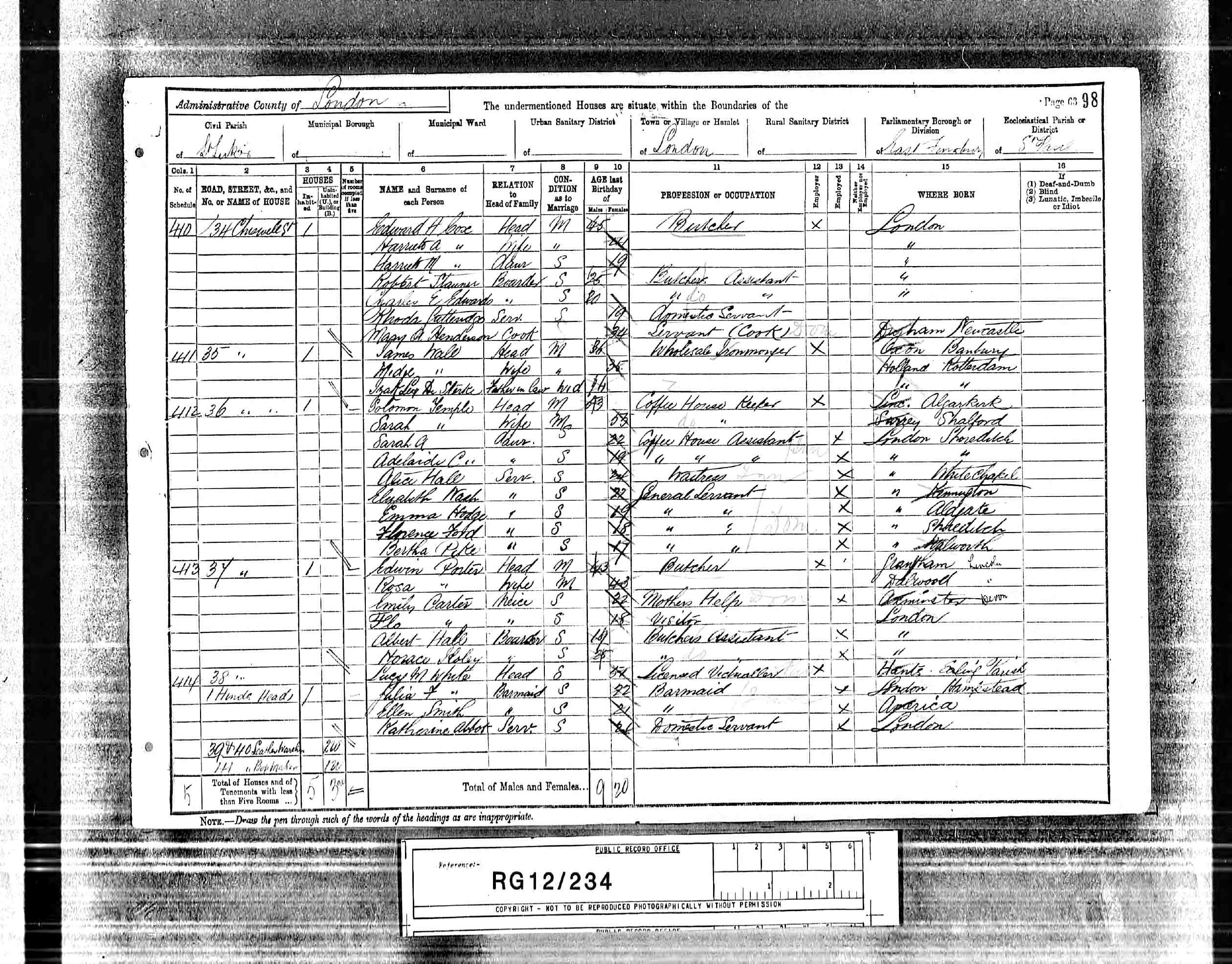 (1891 English and Welsh Census(London, TNA/Ancestry.co.uk, 1992) , Web site showing copies of original enumerator schedules) ID: CEN 1891 RG12, CEN 1891 rg12 234 63 98. Cit. Date: 28 Apr 2007. Cit. ID: CEN 1891 rg12 234 63 98. Surety: 2.
