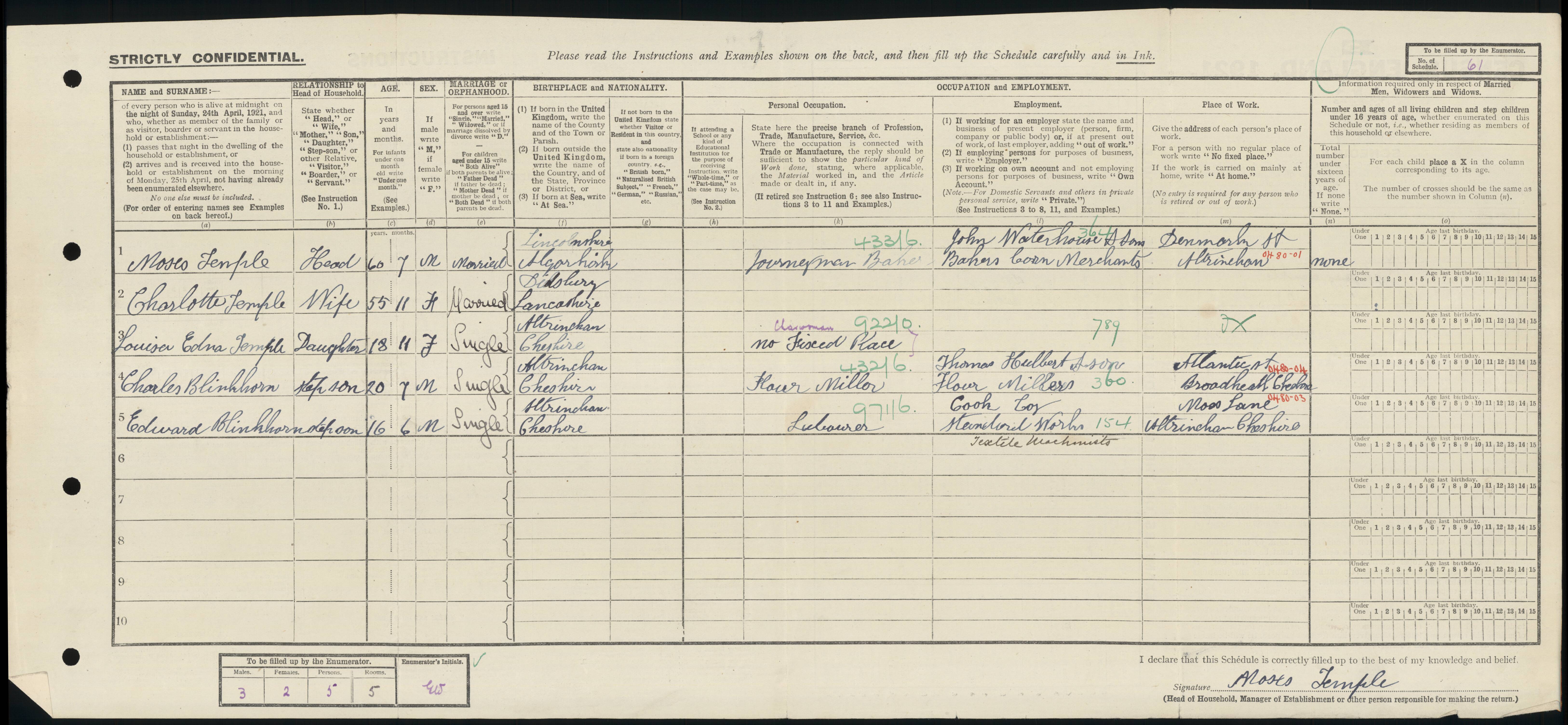• Occupation: Journeyman Baker, 1921, Altrincham, Cheshire, England. Moses married Elizabeth Ellen circa 1886. (Elizabeth Ellen was born circa 1861 in Jersey and died after 1911.) Moses next married Charlotte before 1921. (Charlotte was born circa 1877 in Bidsbury, Lancashire.) |