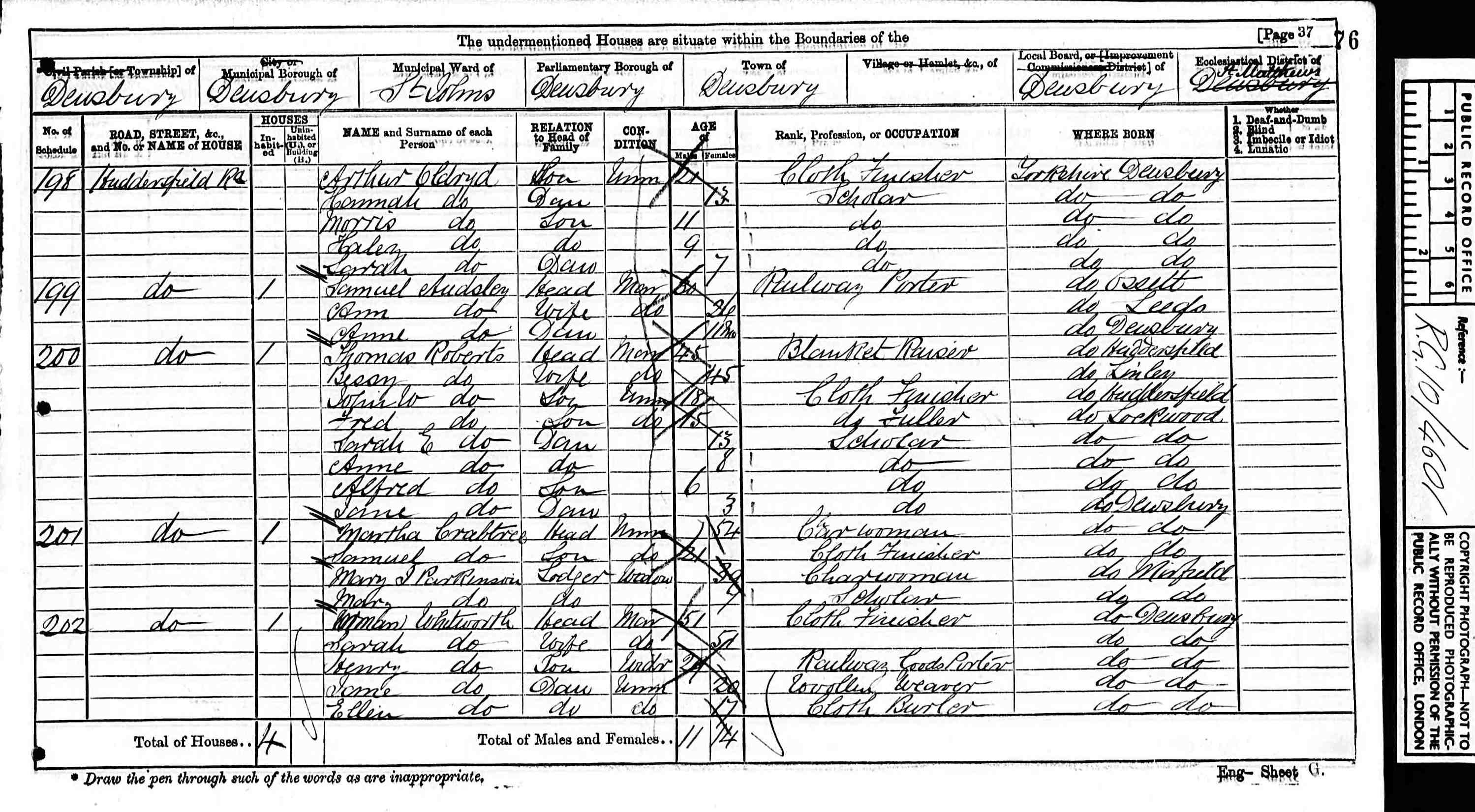 • Lived at: 232 Fall Lane, 1861, Dewsbury, Yorkshire & Yorkshire (West Riding), England. 3 • Occupation: Woolen Cloth Dresser, 1861, Dewsbury, Yorkshire & Yorkshire (West Riding), England. 3