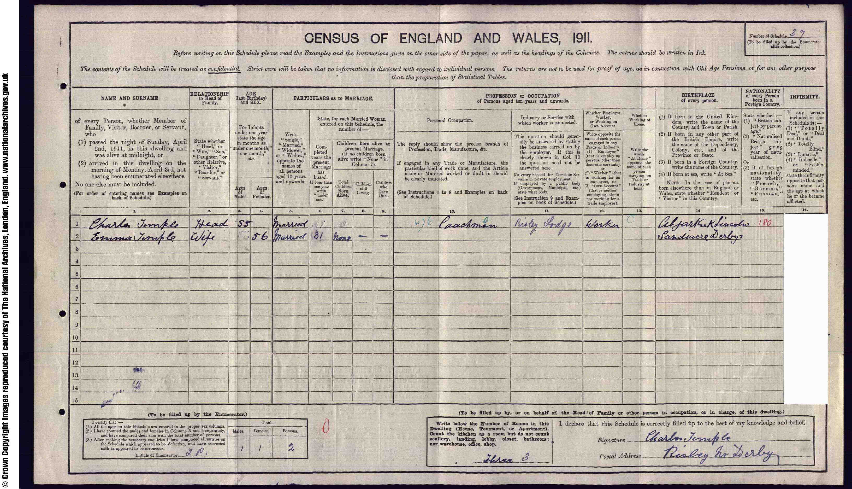 1901 census of England, Derbyshire, Risley, folio 86, page 6, Charles and Emma Temple; digital images, Ancestry, Ancestry.co.uk (www.ancestry.co.uk : accessed 28 Feb 2009); citing PRO RG 13/3208. Cit. Date: 28 Feb 2009. Surety: 4.