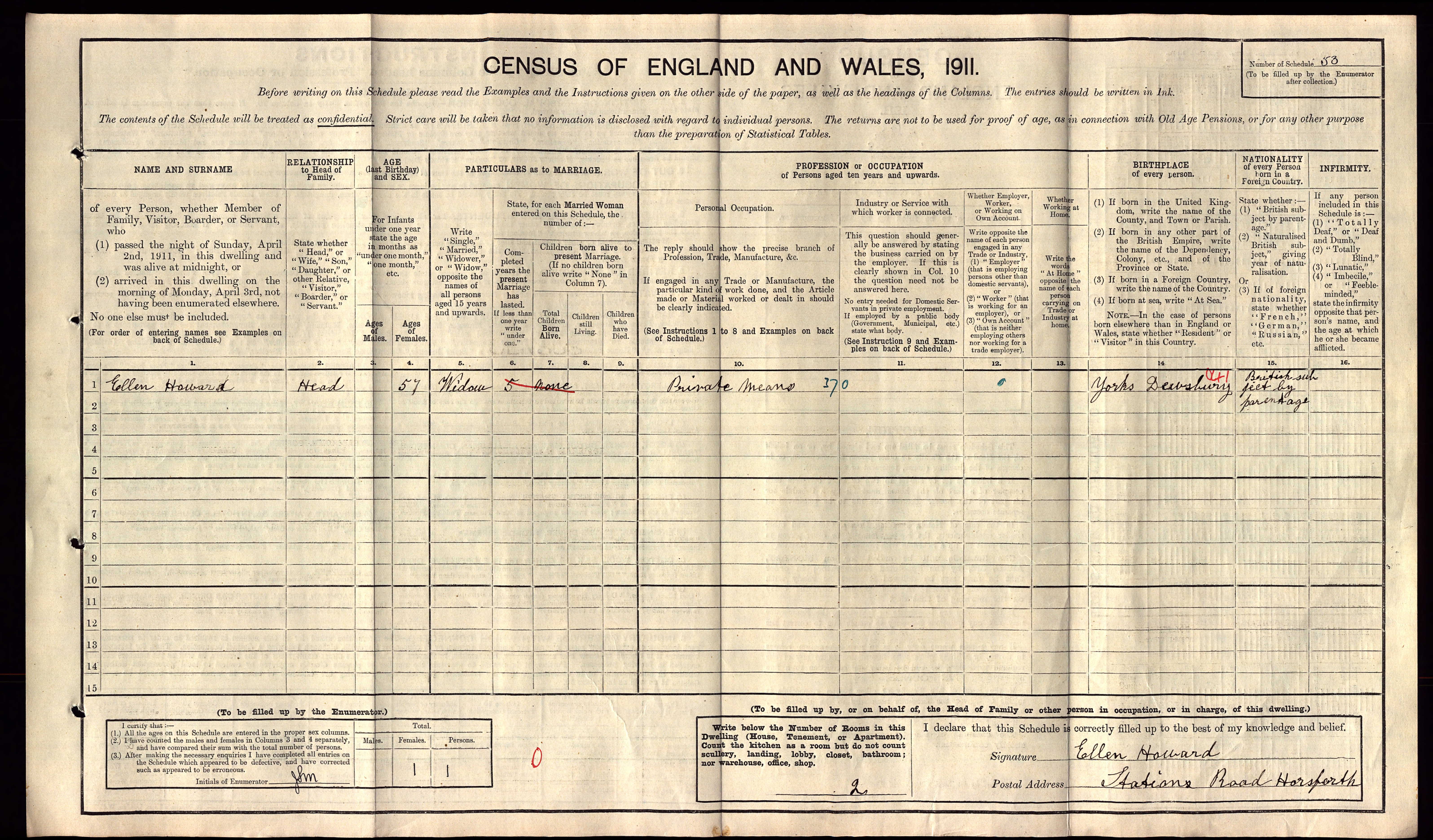 • Lived at: Station Road, 1911, Horsforth, Yorkshire, England. Ellen married Edward Howard on 26 Dec 1903 in Dewsbury West Town, St Matthew, Yorkshire, England. (Edward Howard was born circa 1845 and died Mar Q 1906 in Dewsbury C.B., Yorkshire (West Riding), England.) |