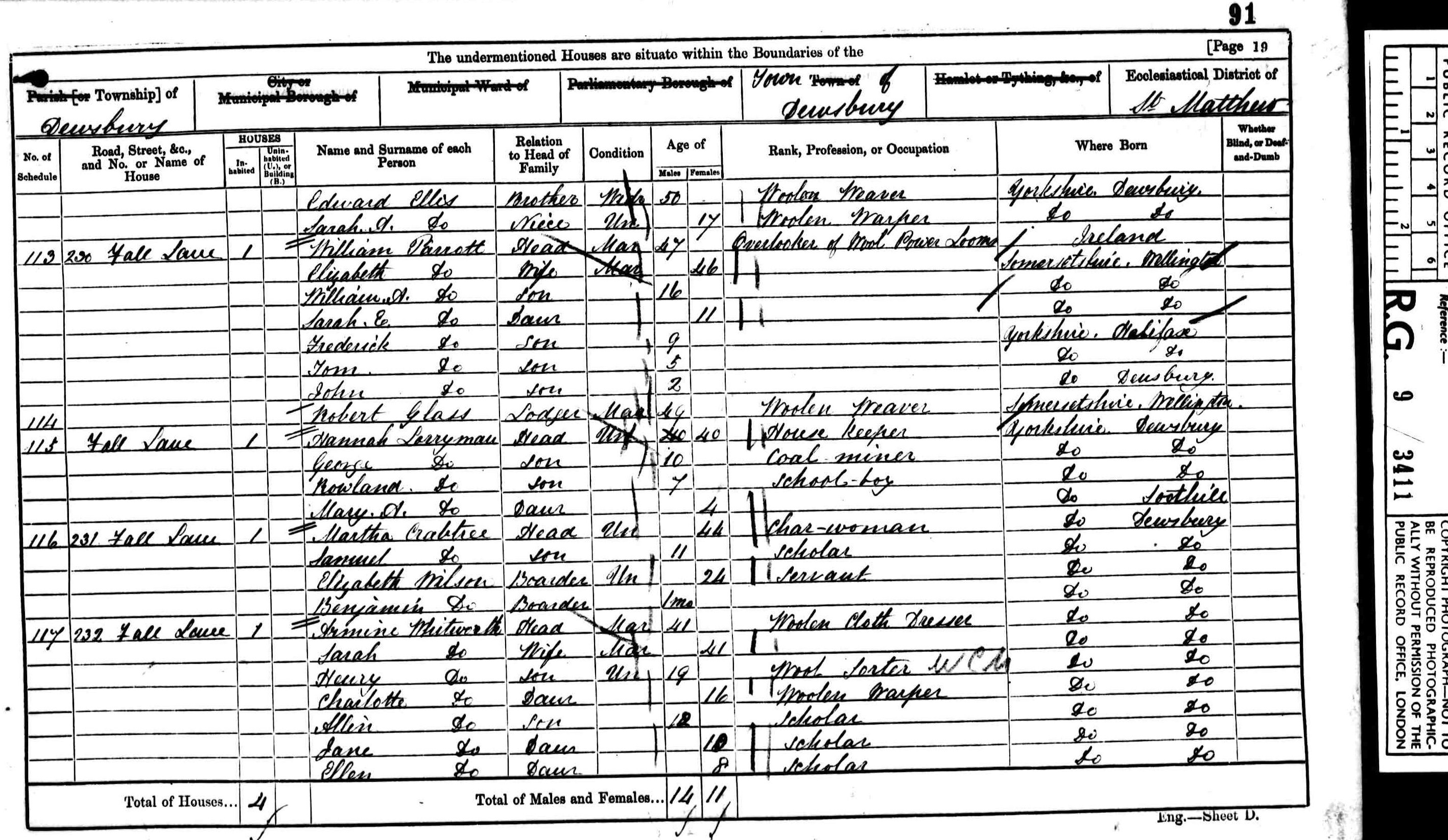 • Lived at: 232 Fall Lane, 1861, Dewsbury, Yorkshire & Yorkshire (West Riding), England. 1 • Lived at: 232 Fall Lane, 1861, Dewsbury, Yorkshire & Yorkshire (West Riding), England. 1 • Lived at: Huddersfield Road, 1871, Dewsbury, Yorkshire & Yorkshire (West Riding), England. 2