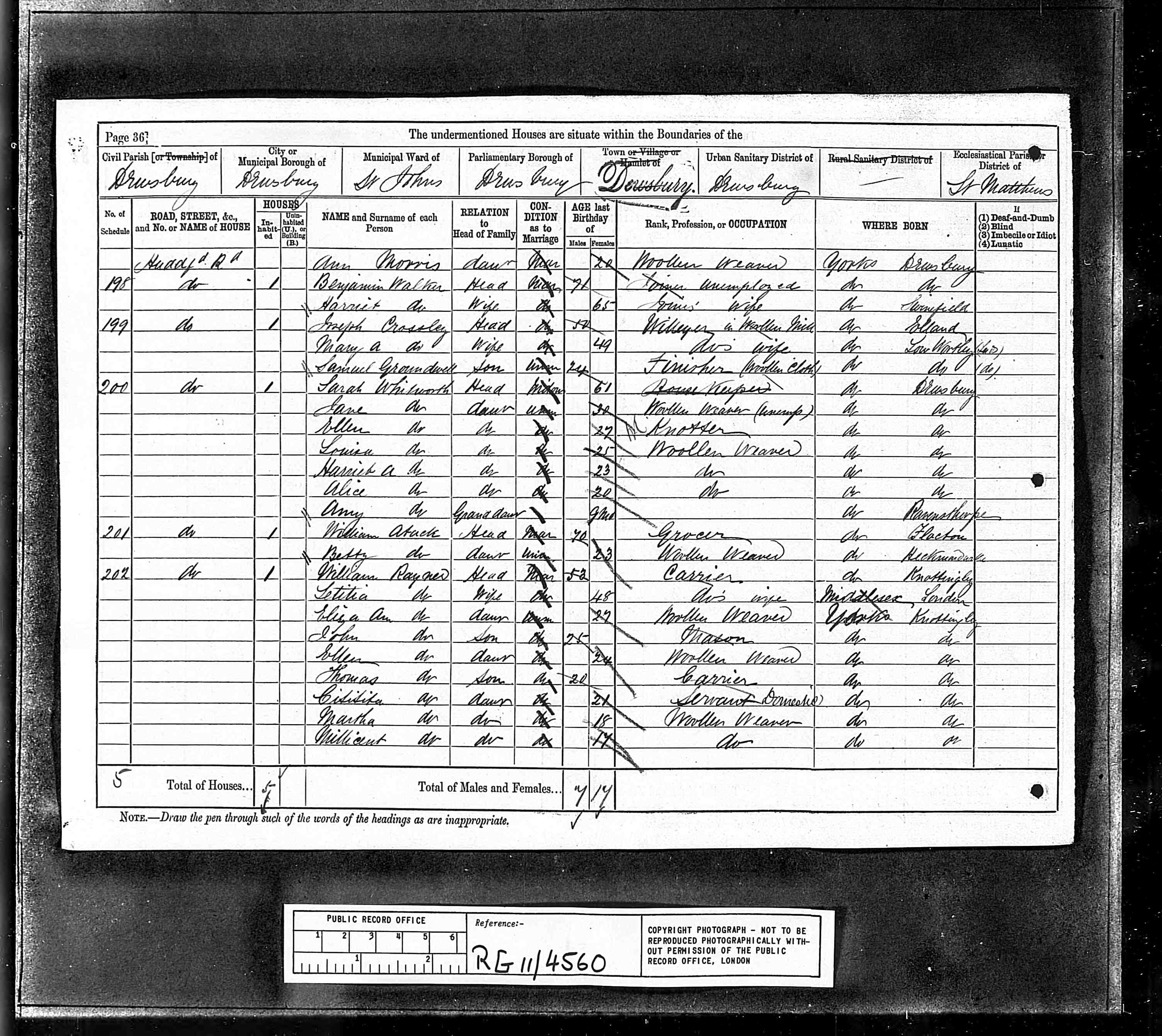 1881 census of England, Yorkshire, Dewsbury, folio 92, page 36, Sarah Whitworth and family; digital images, Ancestry, Ancestry (www.ancestry.co.uk : accessed 1 Mar 2009); citing PRO RG 11/4560. Cit. Date: 1 Mar 2009. Surety: 1.