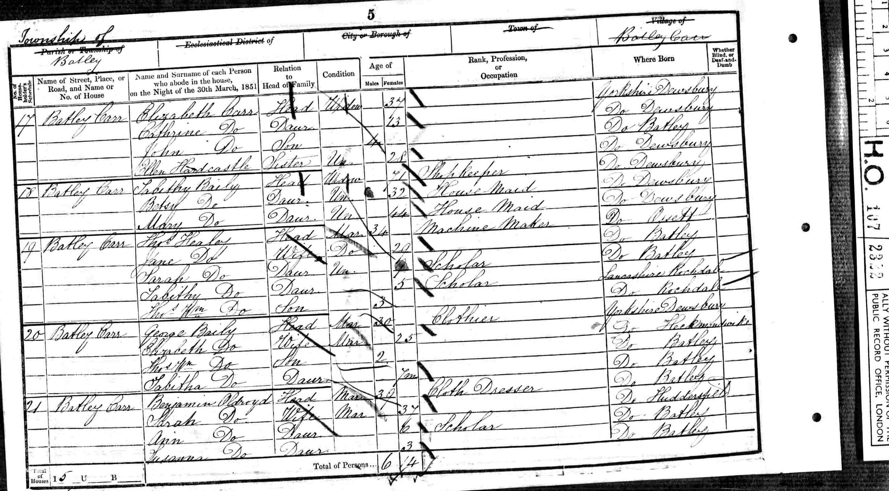 5 Published by Ancestry.co.uk (1851 English and Welsh Census(London, TNA/Ancestry.co.uk, 1952) , Web site showing copies of original enumerator schedules) ID: CEN 1851, 1851 Census Batley Carr Piece 2322 Folio 225 Enum Dist 1C page 5. Repository: Call Number: film 0087558. Cit. Date: 17 Mar 2004. Cit. ID: CEN 1851 Batley Carr. Surety: 3.