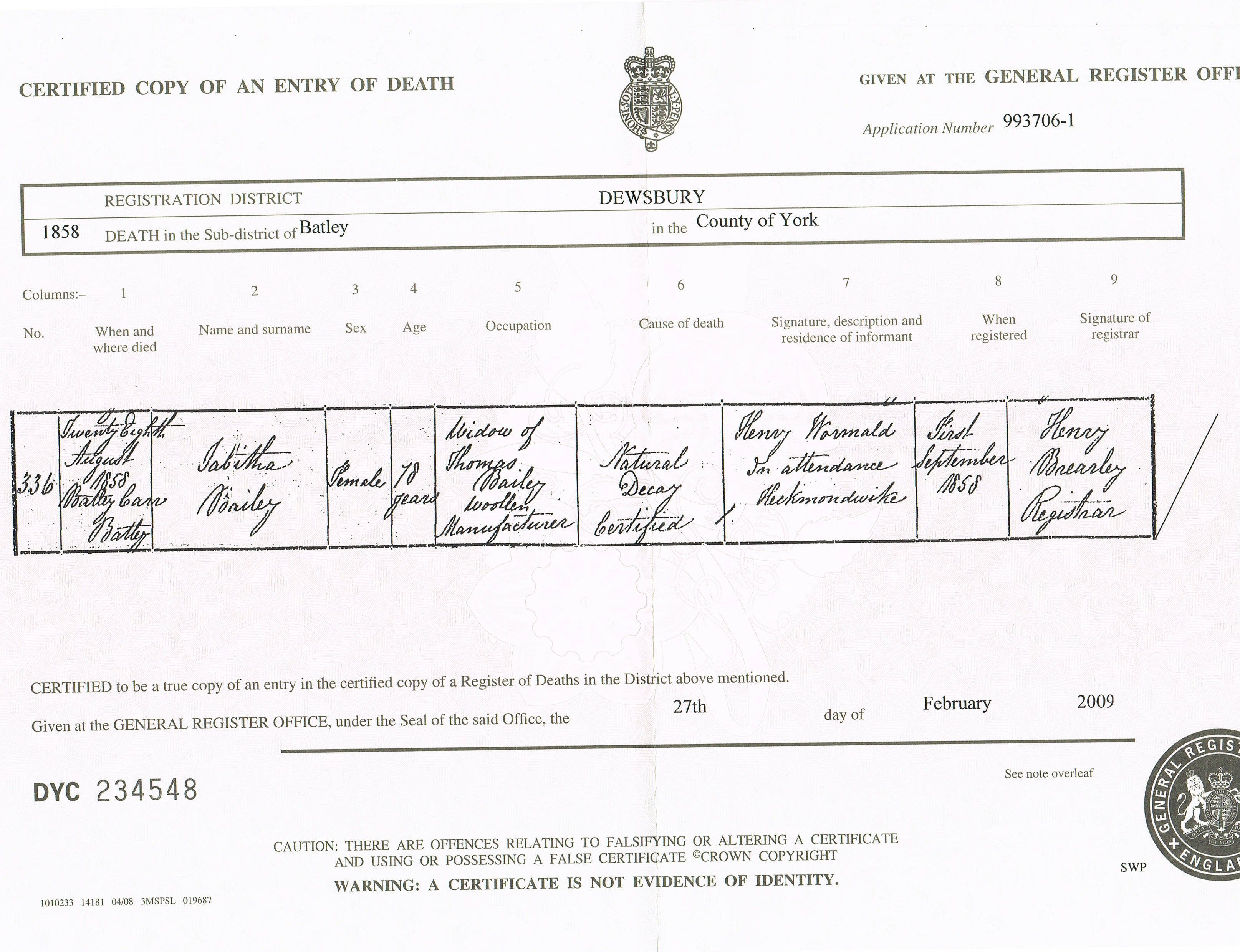 6 England and Wales, death certificate for Tabitha Bailey, died Twenty Eighth August 1858; citing /336, September quarter 1858, Dewsbury registration district, Batley sub-district; General Register Office, Southport. Rec. Date: Jul 2008. ID: DC. Cit. Date: 9 Mar 2009. Cit. ID: DYC 234548, Surety: 4.
