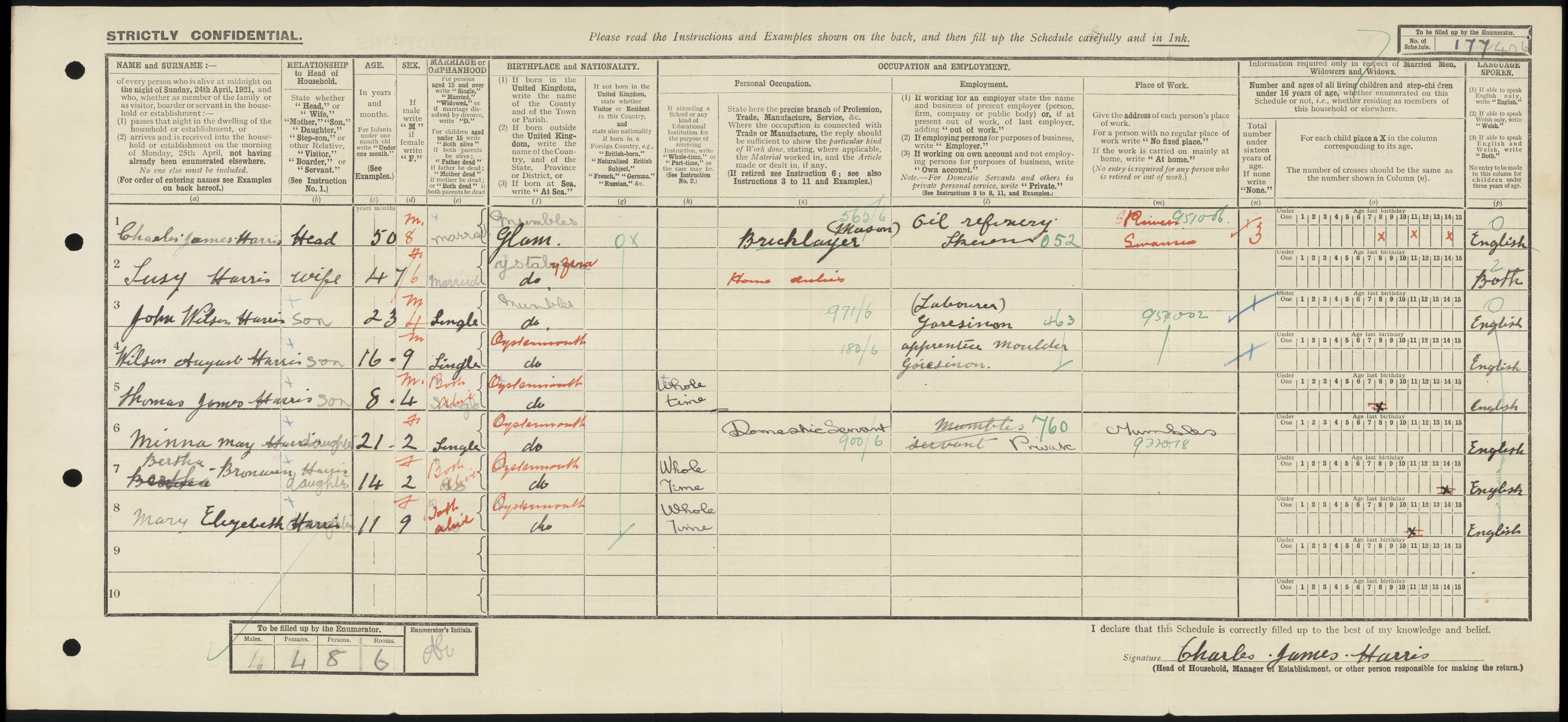 • Occupation: Bricklayer (Mason) Oil refinery, 1921, Gower, Glamorgan.